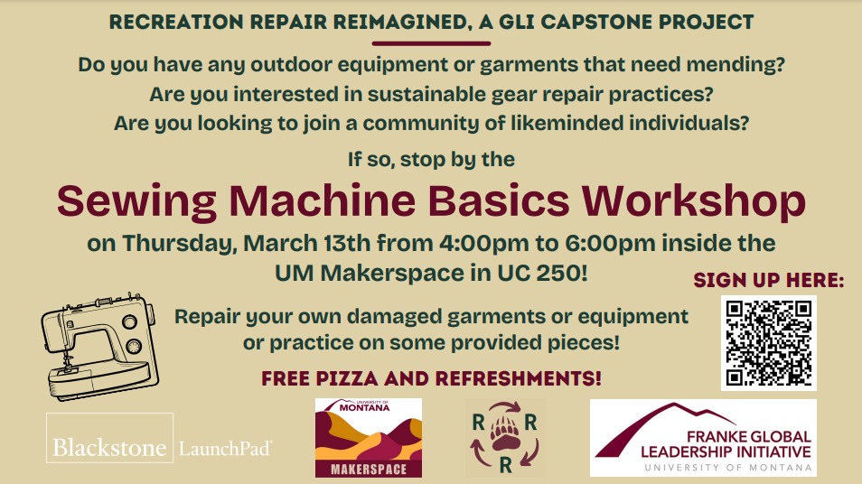 Do you have any outdoor equipment or garments that need mending? Are you interested in sustainable gear repair practices? Are you looking to join a community of likeminded individuals? If so, join us for our next workshop on Thursday, March 14th 4:00-6:00pm in the UM Makerspace UC 250! | |