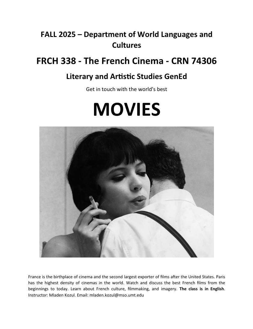 FRCH 338, The French Cinema with Mladen Kozul. The class is taught in English and is a LASC GenEd.