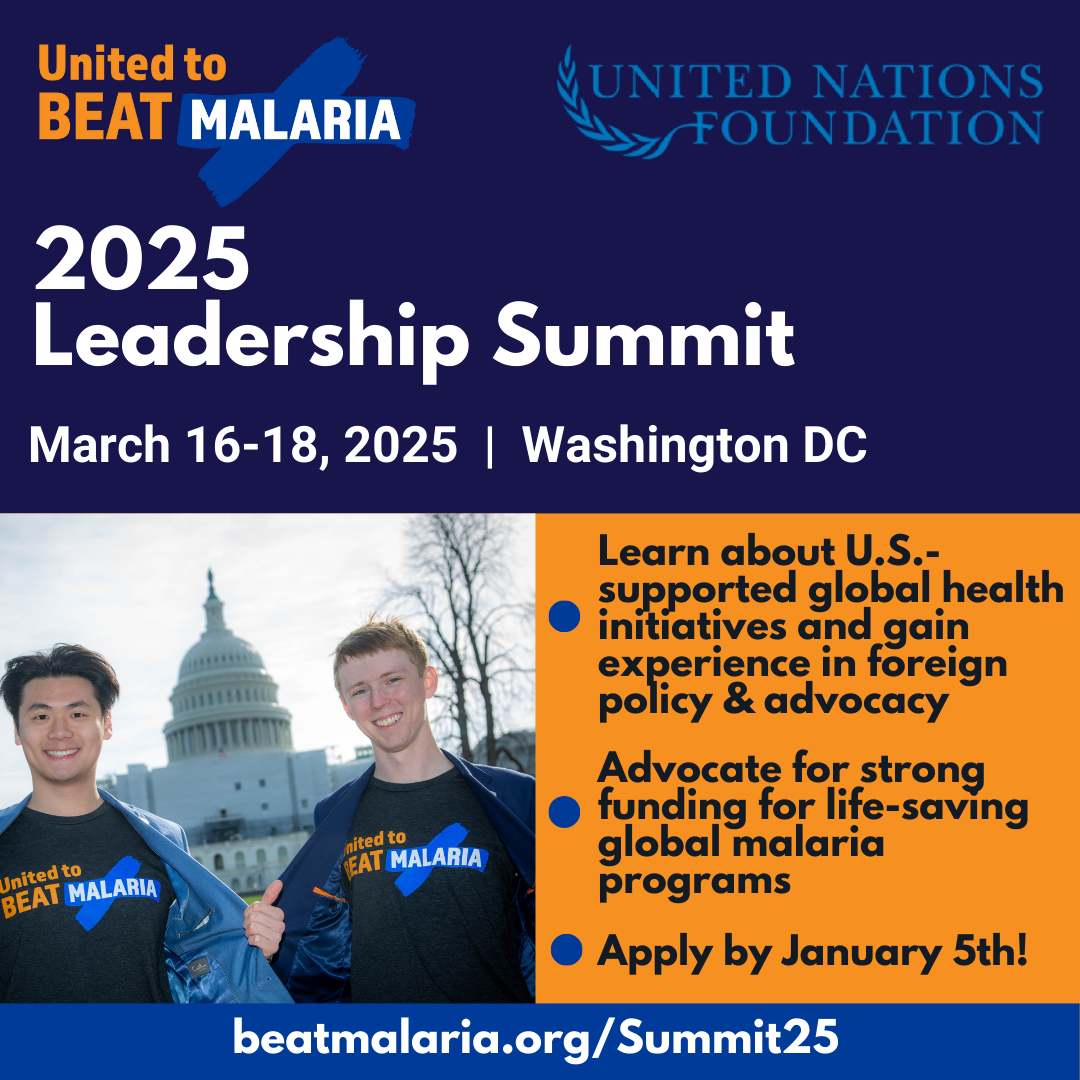 United to Beat Malaria, a campaign of the United Nations Foundation, invites students, researchers, and faculty to apply to attend our 2025 Leadership Summit, which will be held in Washington, D.C., from March 16-18th, 2025. This 3-day conference consists of 2 days of training and workshops to increase your knowledge of the challenges, opportunities, and funding needs for U.S.-supported global malaria programs. It culminates in a day of advocacy on Capitol Hill, mobilizing support for these programs with members of the United States Congress. These programs rely on funding through the U.S. Congressional budget to do their life-saving work of building more resilient health systems globally.
