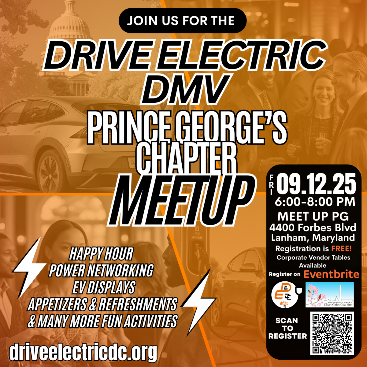 Calling all EV Drivers, enthusiasts and community members in Prince George's County. Join us for a fun and informative meetup with Drive Electric DMV to learn all about electric vehicles! Use this happy hour to network, learn, and connect.