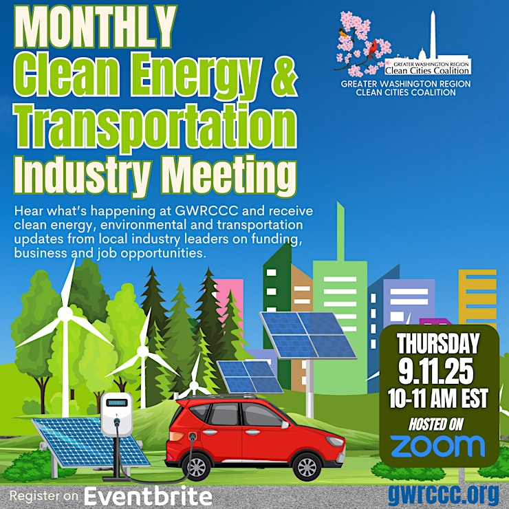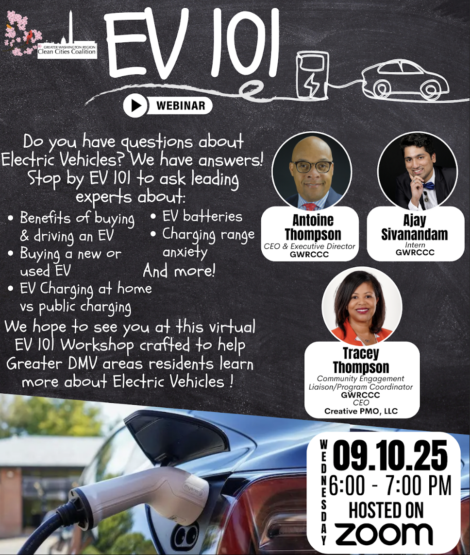 GWRCCC's EV 101 workshop will take place September 10th over zoom from 6:00-7:00pm. The GWRCCC and Drive Electric DMV & PGC Happy Hour, Friday September 12th, 6pm to 8pm, at 4400 Forbes Boulevard, Lanham, Maryland. Register Today for the GWRCCC Annual Clean Energy & Transportation Conference on October 23, 2025, at https://gwrccc.org/annual-conference. The conference will have over 12 workshops, training, vehicle and fleet showcase, silent auction, ride and drive, luncheon awards, a reception, a legislative update and much more. Sponsorship and branding opportunities are available.