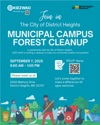 The City of District Heights, in partnership with ASEZ WAO, will host the Municipal Campus Forest Cleanup to bring residents, volunteers, and faith-based organizations together in a day of action, fostering civic pride and demonstrating the positive impact of community collaboration!