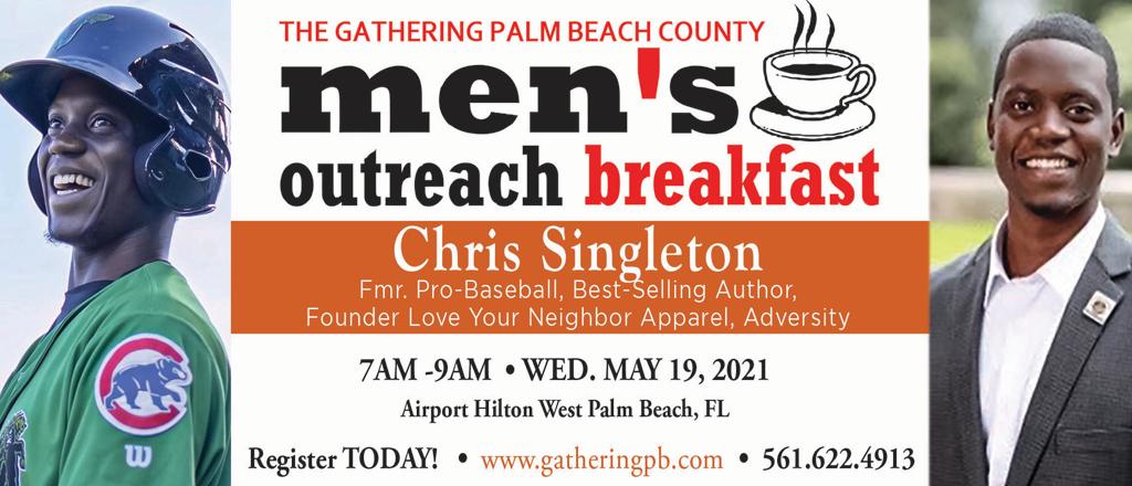 Join us for The Gathering Spring Men's Outreach Breakfast on Wed., May 19, 2021 @ the Airport Hilton Palm Beach. Our speaker is Chris Singleton - former Pro-Baseball Player, Best-Selling Author, and Founder of 'Love Your Neighbor' Apparel. Chris turned personal tragedy into triumph following the murder of his mother in the Charleston, SC church shootings.