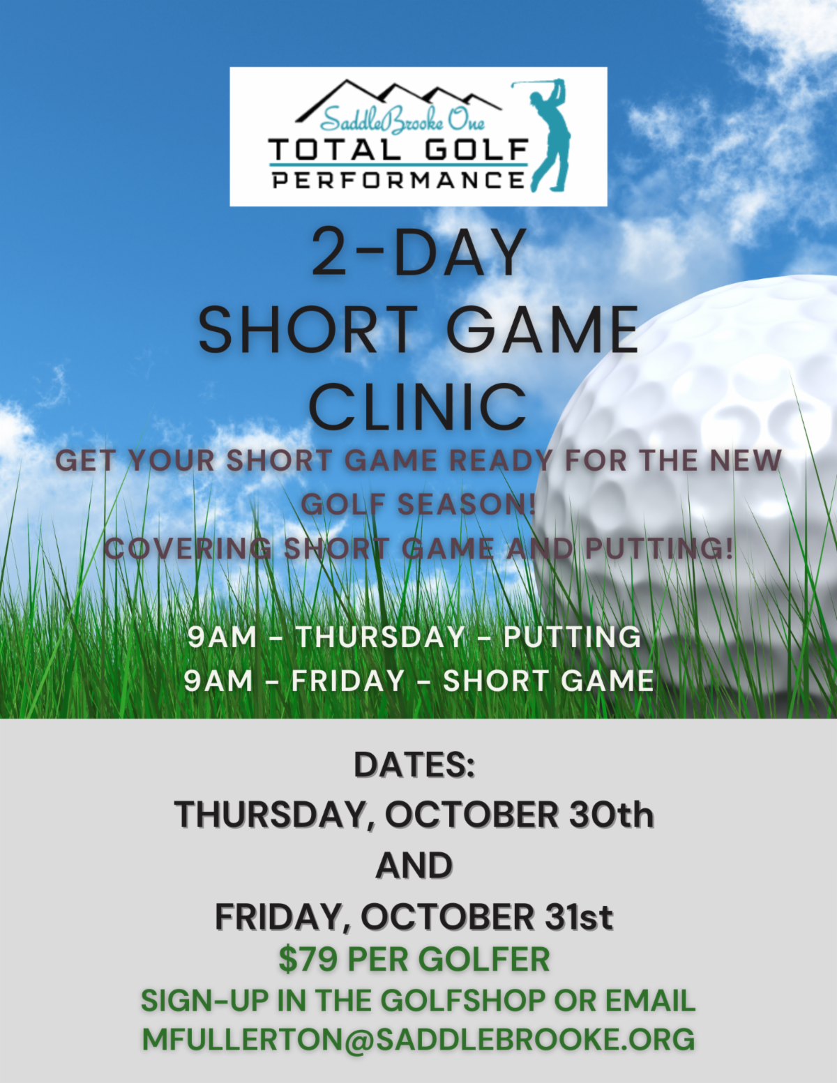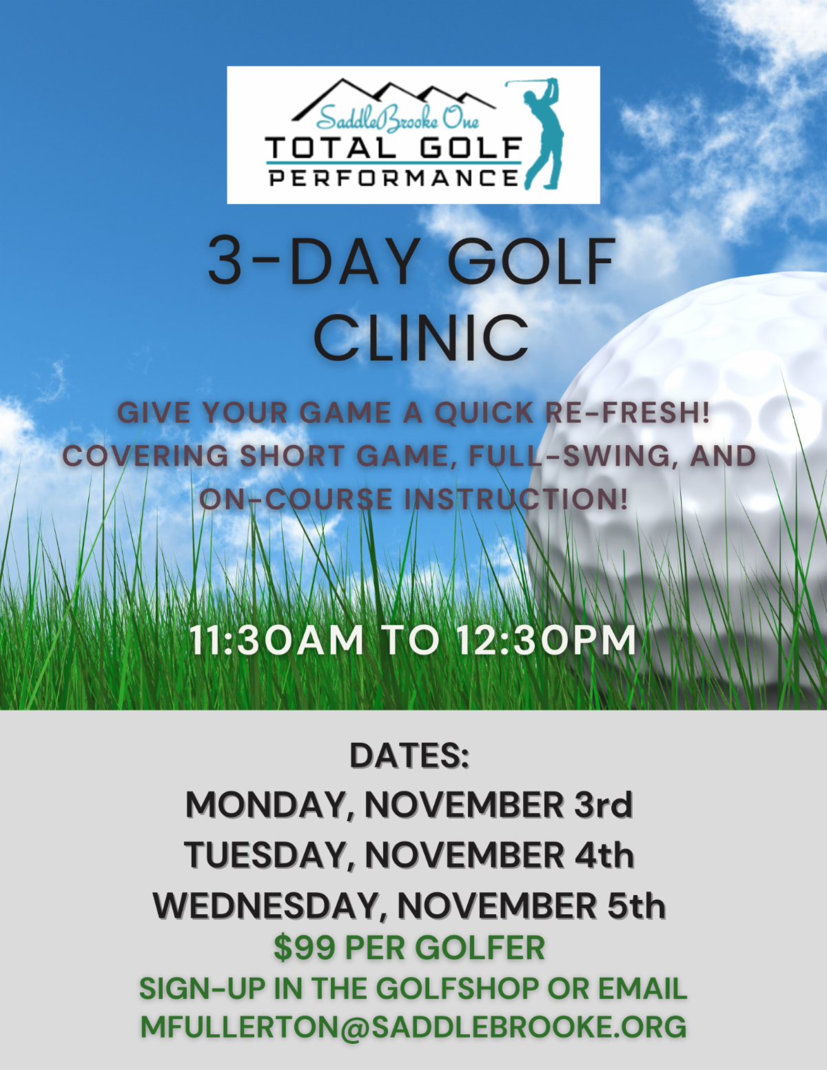 The golf maintenance staff continues with the over-seed process. This week the SaddleBrooke Course and Driving Range re-opened to golf and practice. The chipping green and short game area remain closed. The Catalina Course will re-open next week! Thank you for your cooperation and patience with the overseed process.