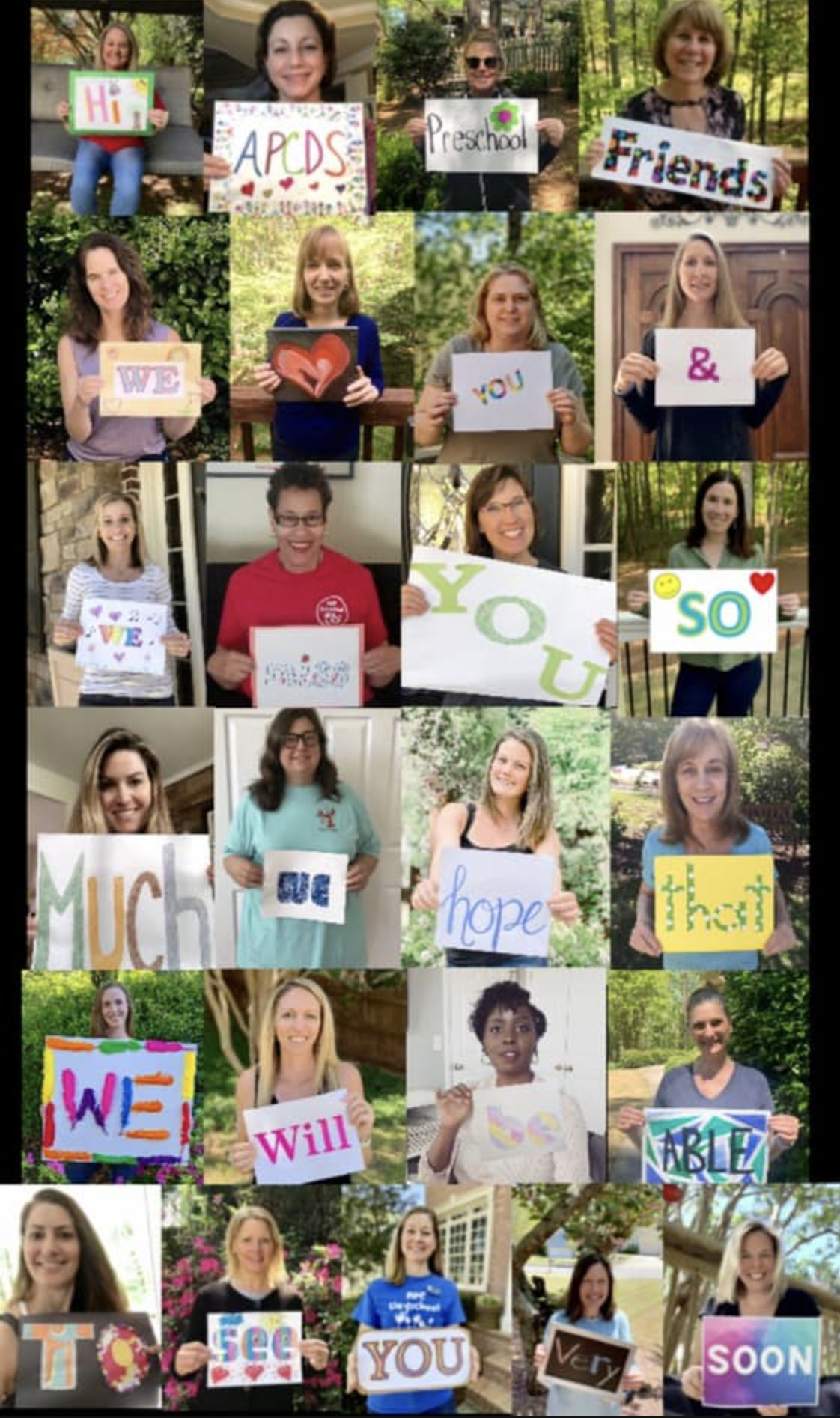 Dayschool teachers teamed up to create a photo collage containing a sweet message for their young students and their families. The message read "Hi APCDS preschool friends, we love you and we miss you so much! We hope that we will be able to see you very soon."