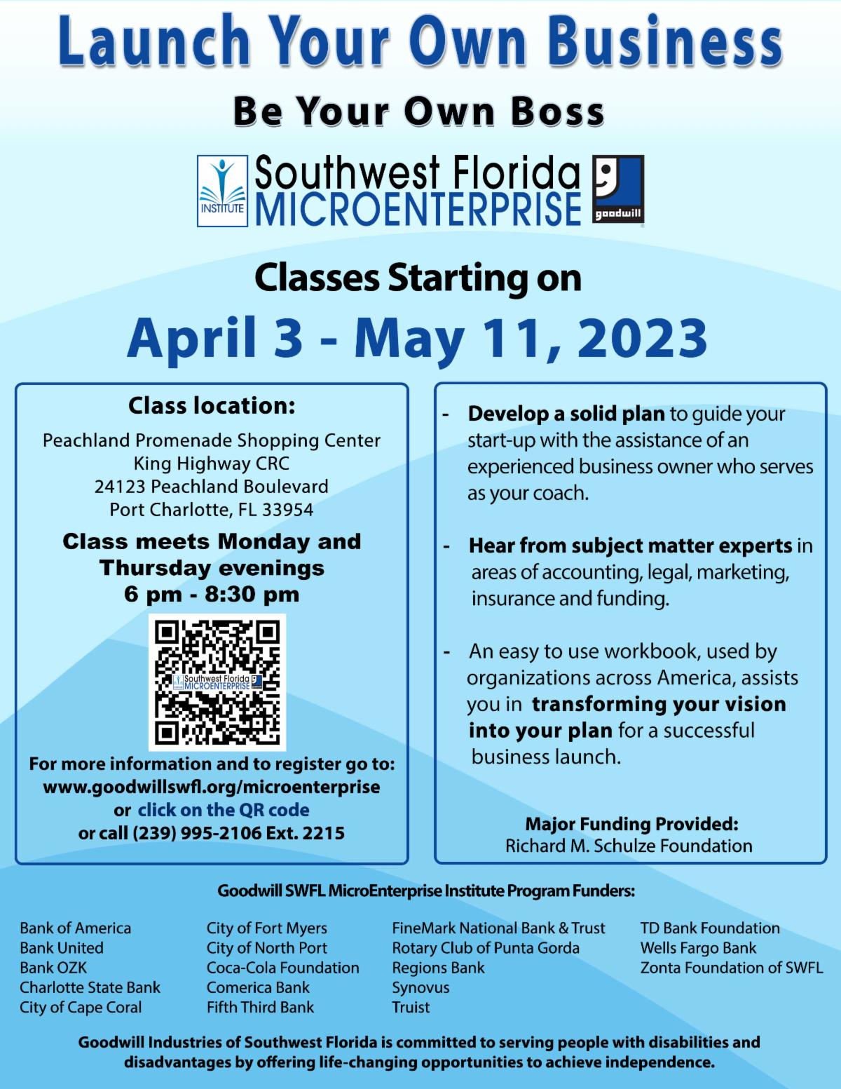 Our next Charlotte County small business class begins April 3rd at the Charlotte County Community Resource Center located inside of the Kings Highway Goodwill (24123 Peachland Blvd., Unit B-1, Port Charlotte.