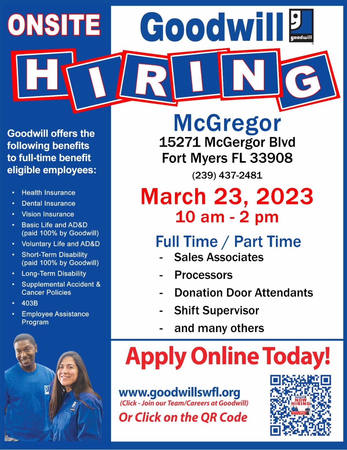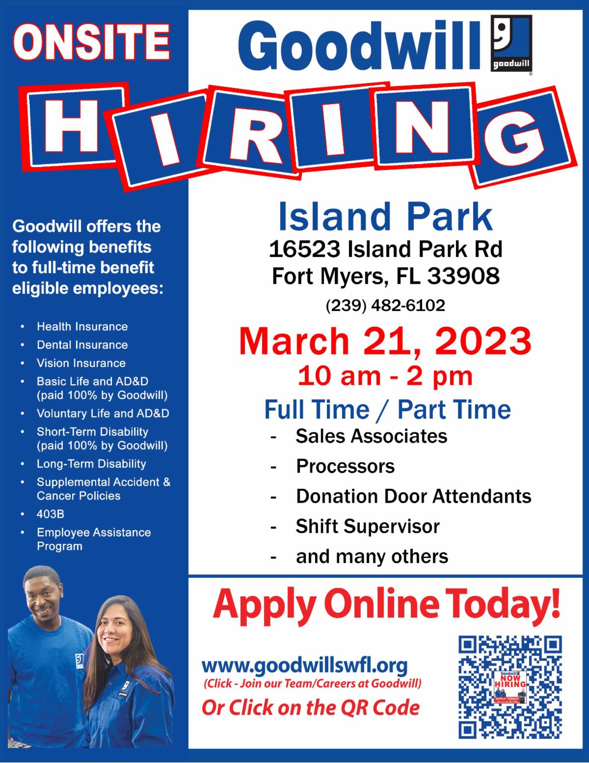 Come out to the Island Park Goodwill located at 16523 Island Park Road in Fort Myers, on Tuesday, March 21st from 10am - 1pm, and McGregor Goodwill at 15271 McGregor Blvd in Fort Myers on March 23rd from 10am - 2pm for an onsite hiring event. Full and part time positions available. Join our team. Goodwill offers benefits, an Employee Assistance Program and opportunities for training and advancement.