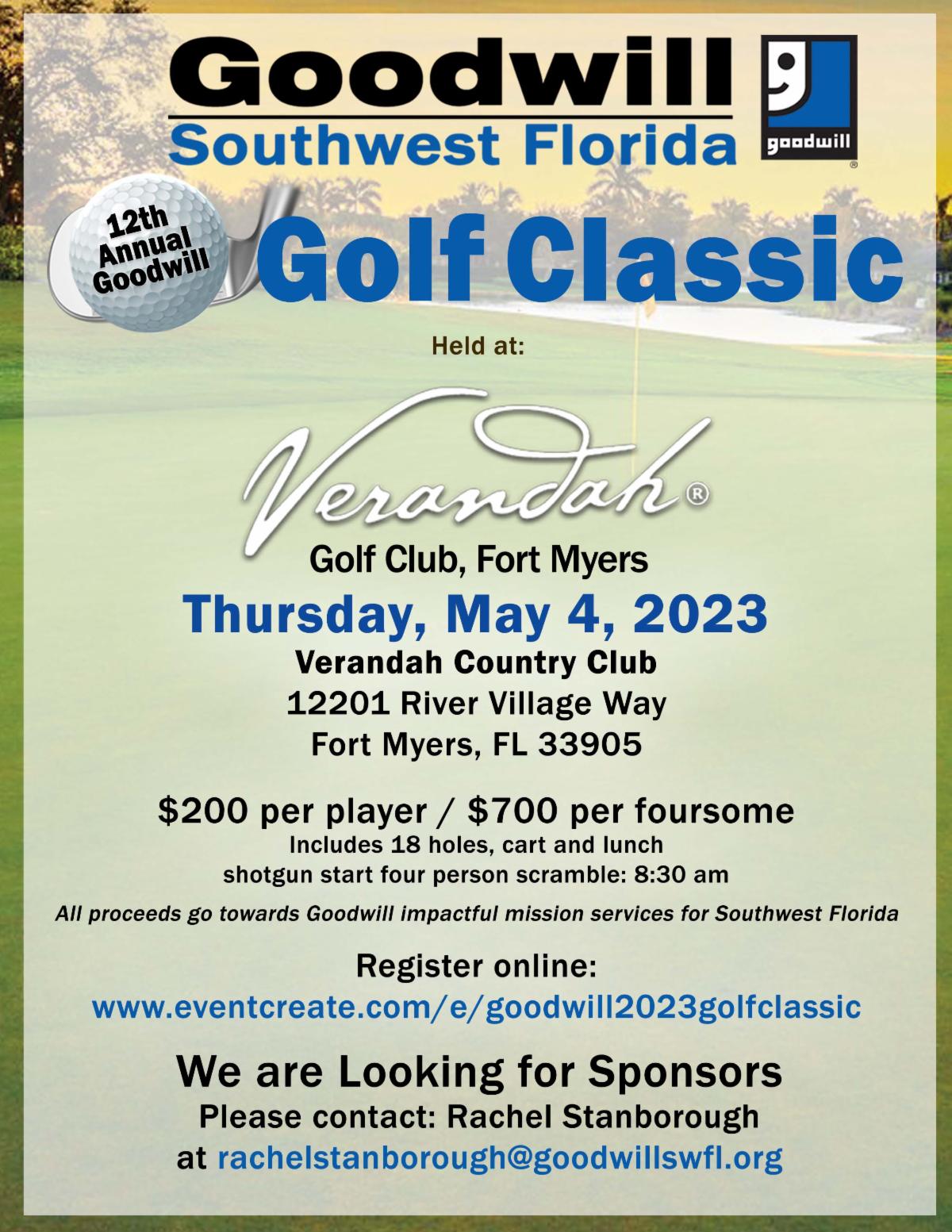 Please join us on Thursday, May 4th, 2023 for our 12th annual Goodwill Golf Classic fundraiser May 4, 2023 at the Verandah Country Club. Register today! $200 per player/ $700 per foursome, Includes 18 holes, cart and lunch!
