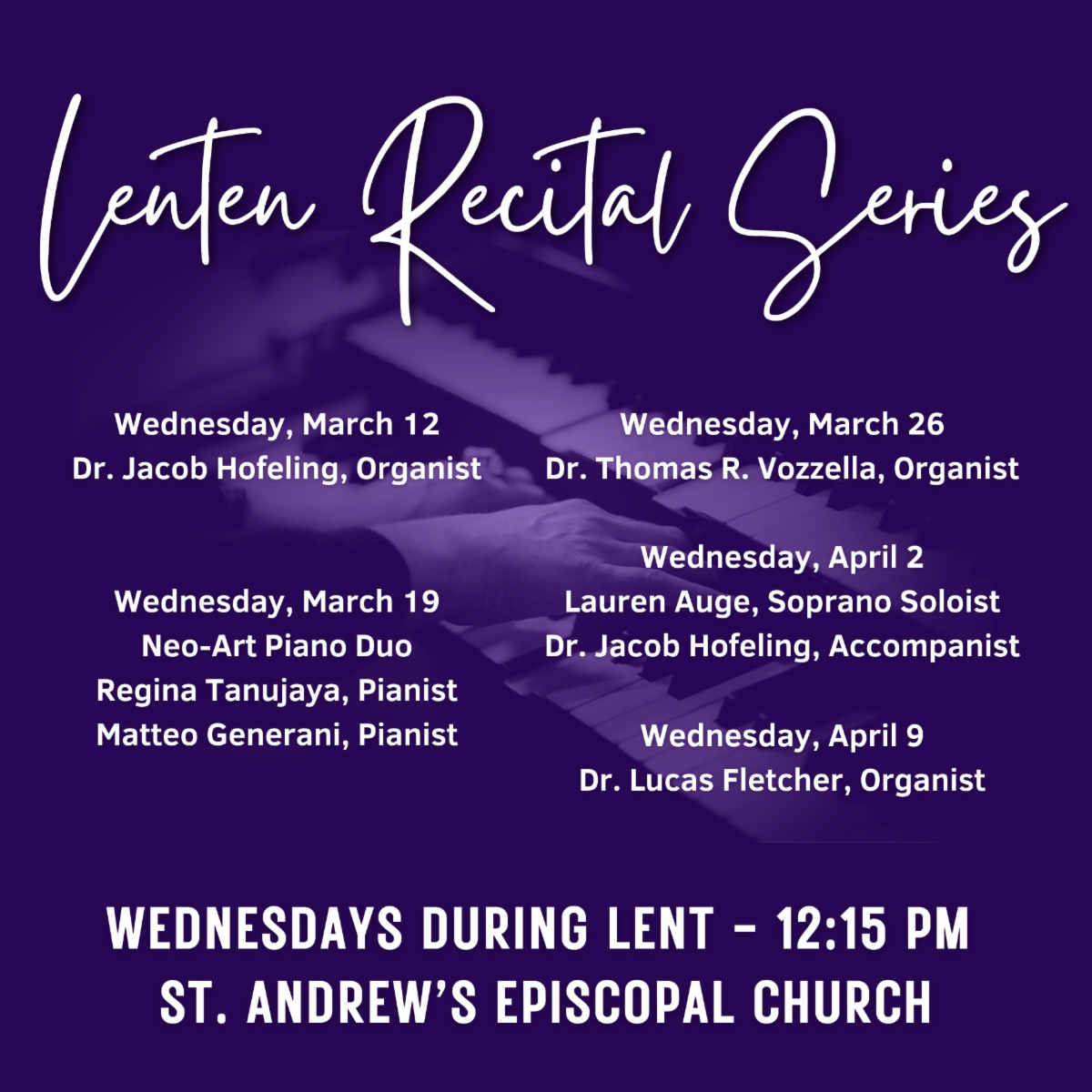 - Join us every Wednesday at 12:15pm for our Mid-Week Lenten Recital Series. The series will kick off Wednesday, March 12 with Dr. Jacob Hofeling, Organist. Wednesday, March 19 will feature Neo-Art Piano Duo Regina Tanujaya and Matteo Generani. Find the rest of the schedule here.