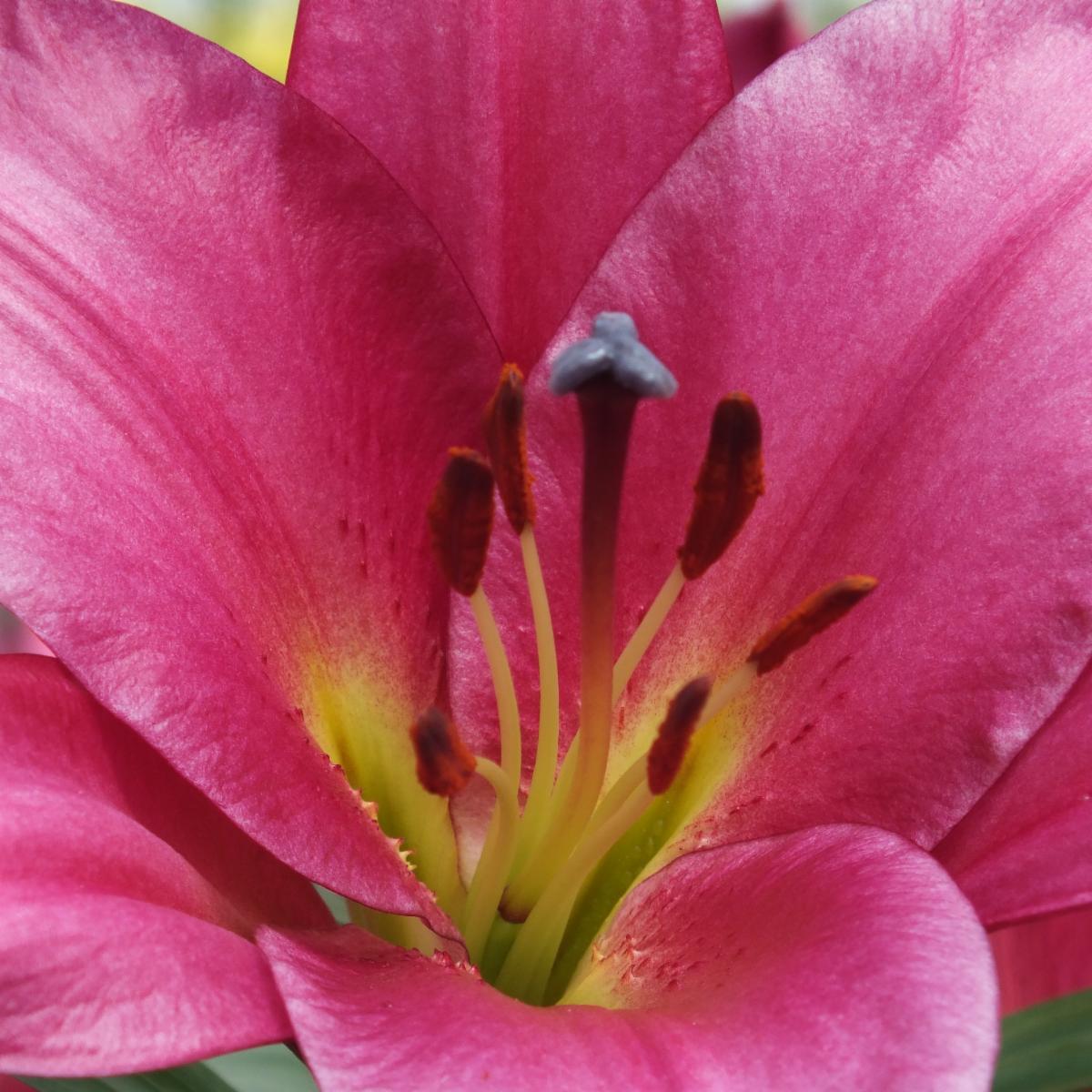 Purple Lady is fluorescent magenta-pink with a lavender sheen, a white heart, green nectary furrows and a sprinkling of rose-pink speckles.