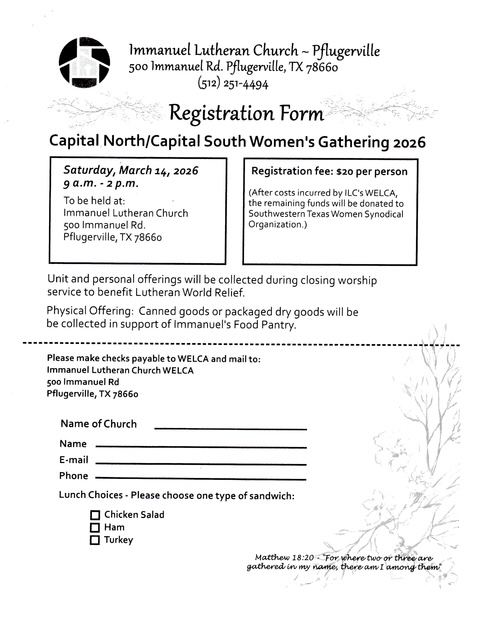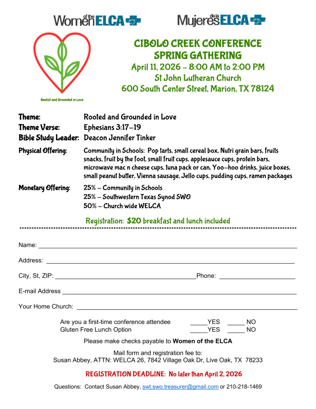 6 registration slots are open at $450/person. Registration includes three nights of lodging and most meals. It is to be paid via check/cash/Zelle to SWT WELCA by April 3rd. To register please send name, phone number and email address to prh.be2025@gmail.com .