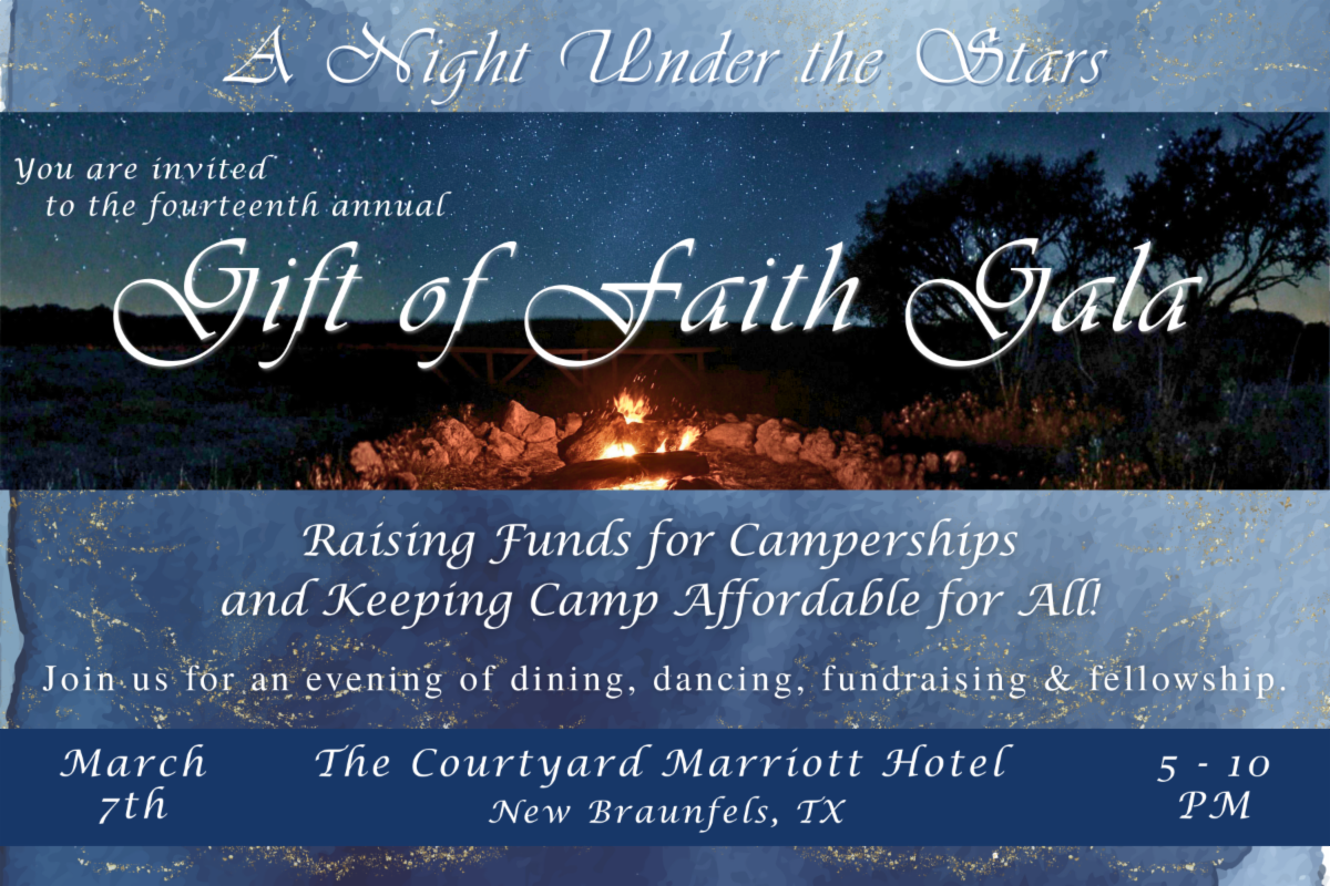 Please join us for a night of dining, dancing, fundraising, and fellowship! This annual event helps us raise the funds for Camperships and help keep camp affordable for all! This year's event will be held on March 7th at the Courtyard Marriott Hotel in New Braunfels, TX from 5pm-10pm. Tickets are on sale now!