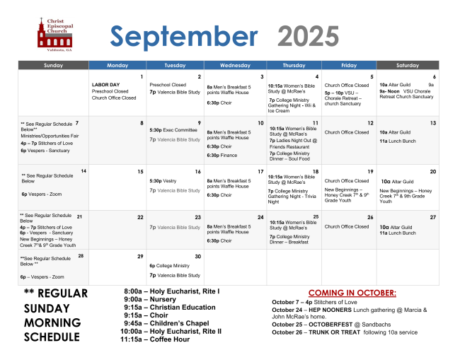 | | | It is time to update our Parish Directory. This is an invaluable tool for any new person in our church community…. especially a new rector. Please keep your eyes peeled in the Sunday bulletin and Friday Grapevine for announcements regarding signing up to have your photo taken. | | New Foyer Groups being formed! Foyer groups are a terrific way to get to know members of the church in a smaller, more intimate setting. Generally made up of groups of 8-10 people who meet monthly, usually for a meal either at the home of someone in the group or at a restaurant. Please sign up at the Opportunities Fair next week, or call the church office to participate. | | The 204th Diocesan Convention of the Diocese of Georgia will take place November 7-8, 2025 in Statesboro, GA. Christ Church can send 3 lay delegates along with clergy, entitled to seat, voice and vote. If you are interested in serving as a delegate, please see Senior Warden, Molly Stevenson. | | Sign up to provide Altar Flowers Altar flowers are a beautiful way to honor your loved ones. And not only do they adorn the altar, after Sunday’s services they are then taken to friends to brighten their day. | | ATTENTION ALL LADIES – Ladies Night Out! - Join us on Thursday, September 11 at 7PM @ Friends Restaurant for a time of fun and fellowship. This is a terrific opportunity to invite a friend and for you to get to know your church family a little better. | | INTERESTED IN THE HISTORY OF THE EPISCOPAL CHURCH: My website Sisters in Faith (sisters-in-faith.org) commemorates forgotten Episcopal deaconesses, those who could not be ordained because they were women. After graduating from deaconess school, many became nurses, teachers, and church helpers in disadvantaged areas both abroad and in the United States. If you have questions or suggestions, please contact Deacon Patricia Marks (spmarks@bellsouth.net; 229-630-8644). | | WOMEN’S BIBLE STUDY: Held on Thursday’s from 10:15a -11:15a. On August 21 the study will be starting a new book called Sacred Fire, A Vision for A Deeper Human and Christian Maturity by Fr. Ronald Rolheiser. Anyone interested in joining can purchase the book and come or call Tammy Borders for more information at 229-560-5889. | | | Griefshare.org Griefshare is a free nondenominational Christian based 13 week program for anyone who has suffered the loss of a loved one. Crossroads Church is hosting this program starting August 18 from 10-12 am or August 19 from 6-8 pm. For more information or to register go to griefshare.org and put in location Valdosta or 31602. Or just show up at the meeting. | | |