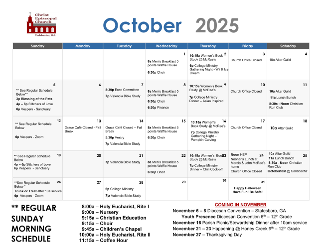 Christ Church participates in a monthly Food/Supplies Drive for Grace Café. For October please bring Halloween candy and pumpkins (for our pumpkin carving event on October 16). A donation basket has been placed in the parish hall for your convenience. Thank you for your generous support of our College Ministry!