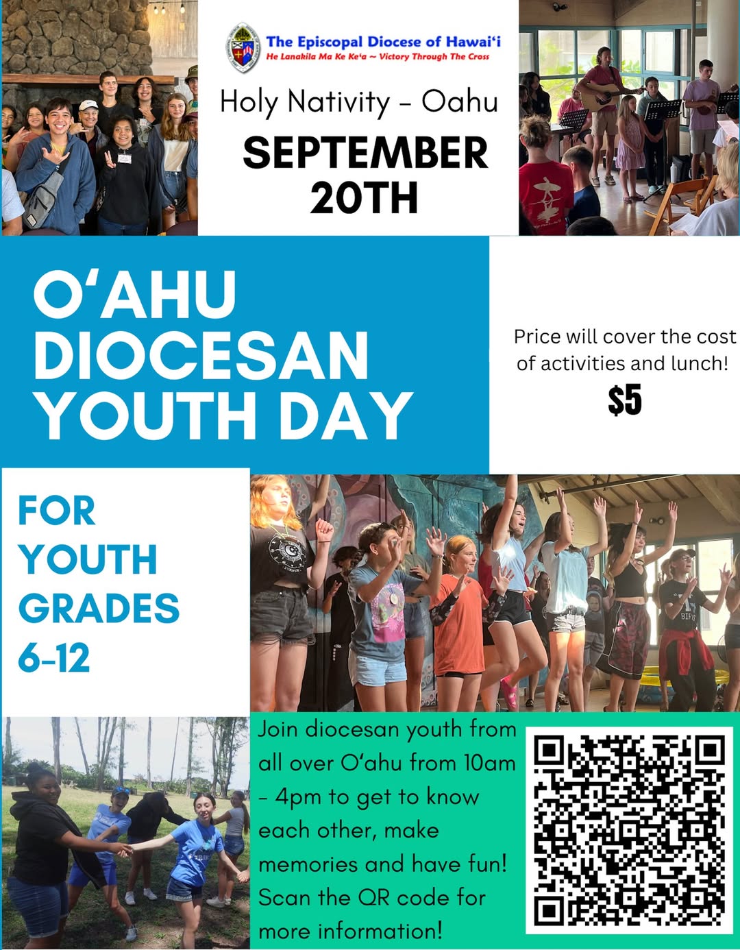 All youth in grades 6-12 are invited to take part in a very special youth event taking place at Holy Nativity Epsicopal Church on Saturday, September 20, 2025. Cost for a full day of activity and fun is only $5 and includes lunch. For more information and to register, scan the QR code in the poster shown. Holy Nativity is located at 5286 Kalaniana'ole Highway in Honolulu.