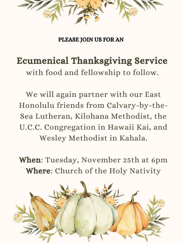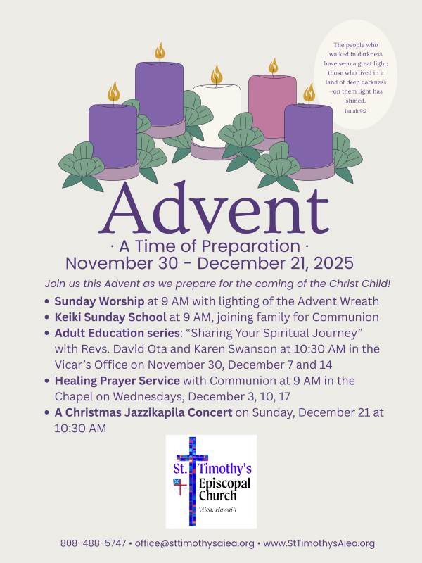 | | WHAT'S HAPPENING IN THE DIOCESE | | Visit the Diocese's Calendar page HERE for Diocesan events & activities. | | Reminder...The Diocesan Profile was released in a special announcement on November 1, 2025. You can view that announcement HERE. The deadline to apply is Monday, December 1, 2025, at 12:00 AM (HST). The profile and link to apply can be found on the Search & Transition webpage HERE. There is also an updated Calendar of Events and Timeline posted on that page. | |