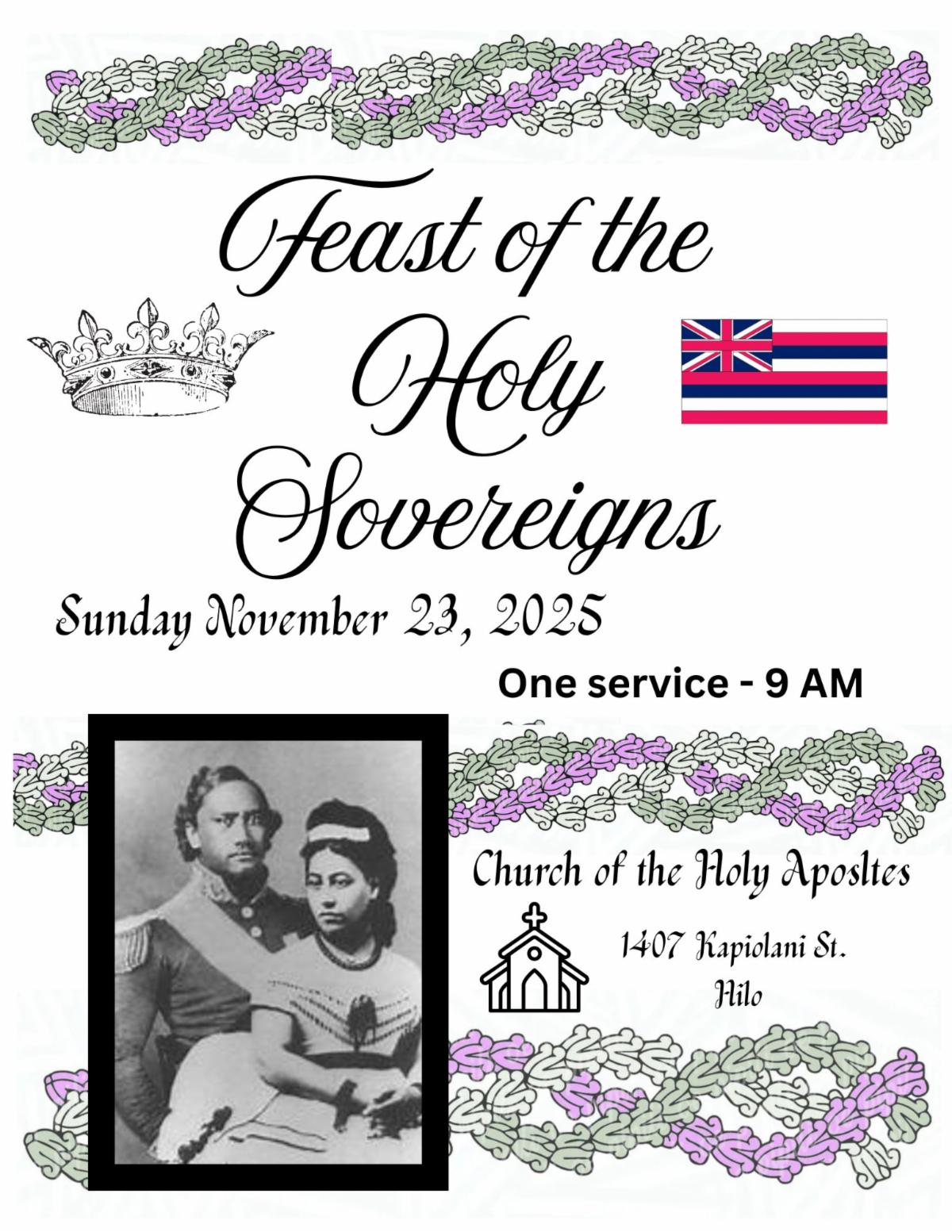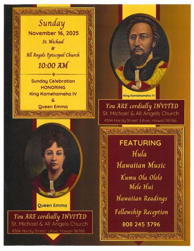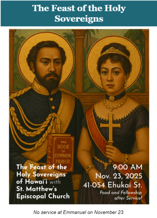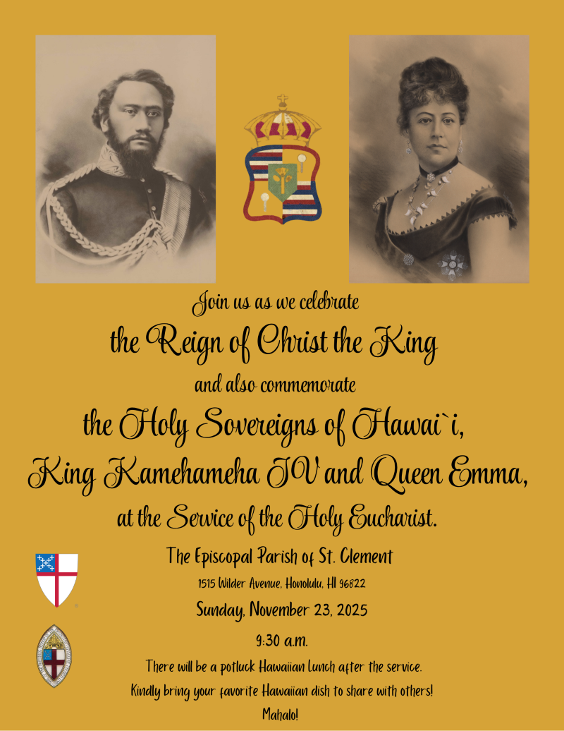 Please join us as we celebrate our Holy Sovereigns, King Kamehameha IV & Queen Emma! We will have two services that morning: 7:00 a.m. & 9:00 a.m. We will welcome Bishop Fitzpatrick with us at the 9:00 a.m. service. Later that evening we will have a special Choral Evensong at 5:30 p.m.
