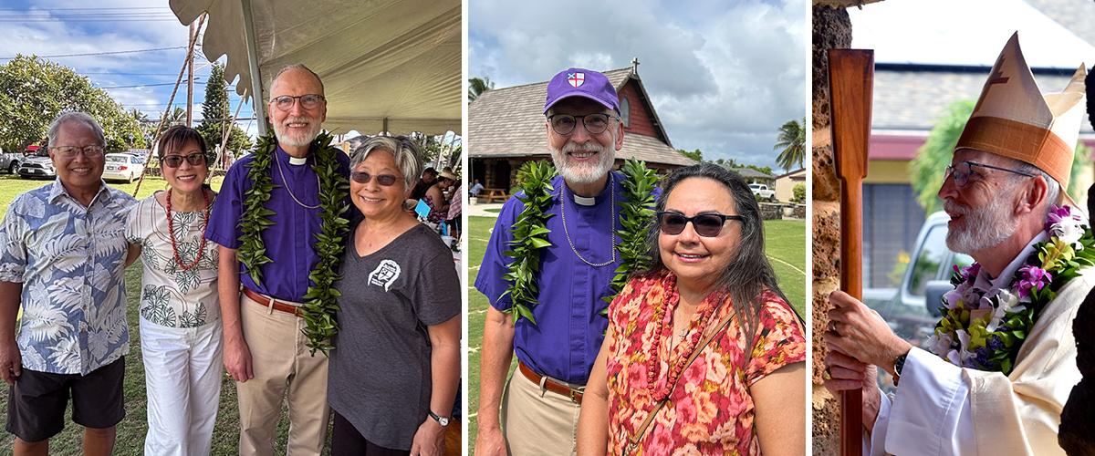 | | Continuing Festivities, Celebrations & Visitations... | | During the past couple of weeks, the Bishop's busy schedule was highlighted with festive school gatherings and two very special church anniversary celebrations. Pictured above, the Bishop and staff members handed out goodies at St. Andrew's Schools' Halloween party, taking their cue from the timely and popular song, "I Sing a Song of the Saints of God" with (from left) Nani Carroll ("one was slain by a fierce wild beast"), Kaori Matsumoto ("one was a doctor"), Rae Costa ("one was a queen"), the Bishop ("one was a priest"), and Canon Sandy Graham ("one was a shepherd 'S' on the green")! The Bishop also shared the story of St. Francis and the wolf who terrorized the town of Gubbio, during the Upper School's Spirit Week, and at far right, reading to the kindergartenders. (Photos from the Bishop's and Cathedral's Facebook pages.) | On Kaua'i, All Saints' welcomed Bishop Bob and Bea to their year-long Centennial celebration wrap up event on Saturday, November 1, 2025, and his official Visitation the following day where he delivered a heartfelt and meaningful sermon as their search for a new Rector winds down. Pictured above left is the Bishop with Junior Warden Ron Morinishi, House Speaker Nadine Nakamura (who is a member and also presented a proclamation), and Senior Warden Faith Shiramizu. More photos and full story about their year-long event will be coming up in the next Chronicle. (Photos: Sybil Nishioka) | | This past weekend, the Bishop spent time on Maui where he met with the Bishop's Committee of Trinity By-the-Sea (that includes Holy Innocents) to discuss Maui's ongoing recovery. Pictured above left are (seated) the Rev. Amy Crowe and the Rev. Deacon Kalani Holokai, (standing from left) Chuck Spence, Pam Silva, Scott Zipf, Joan Villa, Amy Krieger, Maggie Kottke, Katy Shroder, Chris Gale, Bishop Bob, and Diane Delos Reyes. The Bishop also blessed the new ACCW van (see header photo at top), and celebrated St. John's 125th anniversary as well as his official Visitation on Sunday. At center, he is pictured with Bella Hernandez from St. John's who remembered his promise to let her try on his "funny hat" the next time he visited. He is also pictured on the footsteps of St. John's before Sunday service. Standing in front with the Bishop is the Rev. George Wong, and on the stairs is visiting clergy the Rev. Andrew Walmisley, Senior Warden (Crucifer) Joseph Cascio, and the Rev. Hau'oli Tomoso. Photos and story of their anniversary event will be coming up in a future Chronicle. (Photos from the Bishop's Facebook page) | | | | Be sure to stay informed with the Bishop's latest messages by clicking on the button shown. All video messages also appear on the Dioceseʻs YouTube Channel and Facebook page. | | |