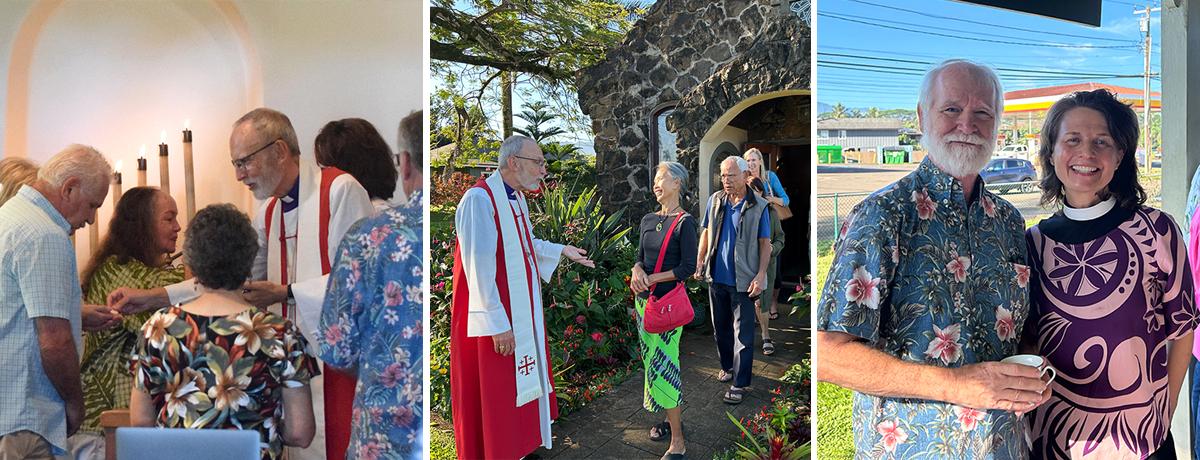 | | Visitation on the Garden Island | | The Bishop visited Christ Memorial Episcopal Church in Kilauea, Kaua'i, on Sunday, January 11. The historic stone church is one of the Diocese's most quaint and picturesque buildings, engulfed in a garden of exotic blooms and foliage, lovingly tended to by members. The Bishop is pictured above with their Vicar, the Rev. Catherine Amy Kropp. Below, the Bishop gives Communion and greets longtime church members. Below right during their post-service refreshments is Branch Lotspeich and Rev. Catherine Amy. (Photos by S. Nishioka) | | | | Be sure to stay informed with the Bishop's latest messages by clicking on the button shown. All video messages also appear on the Dioceseʻs YouTube Channel and Facebook page. | | |