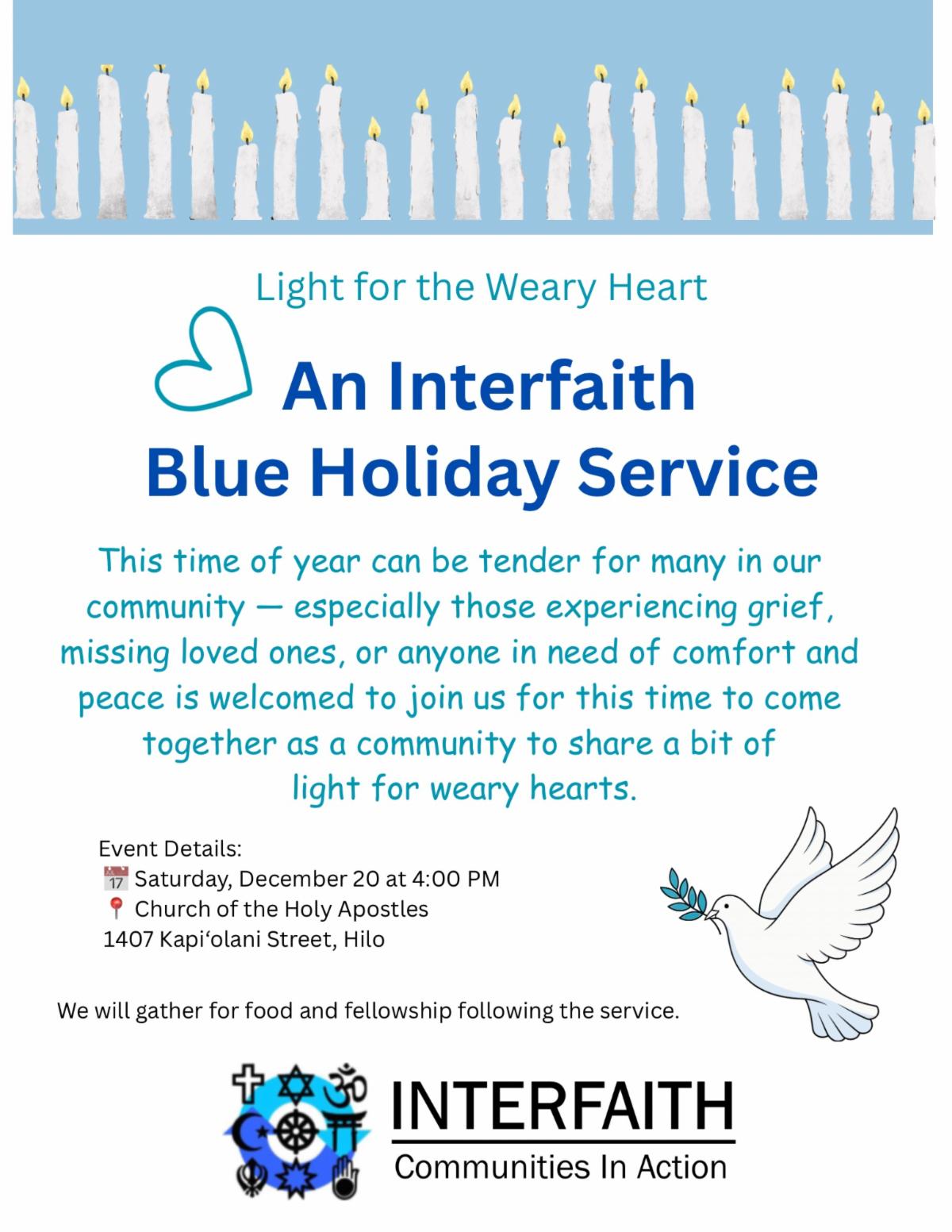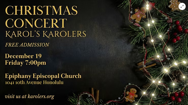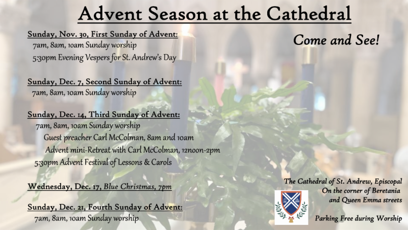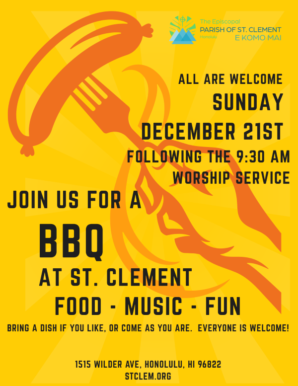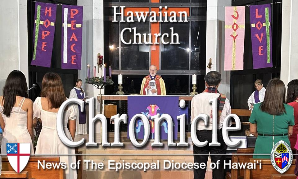 | | Aloha & Welcome to the Diocese of Hawai'i! | | REMINDER: SPECIAL EDITION CHRISTMAS SERVICES ISSUE - All churches should have received an email about submitting your info and graphics for our annual Special Edition Christmas Services Chronicle going out on December 19. Don't be left out! Submission deadline is Wednesday, December 17. If you need help with graphics, send your service info to news@episcopalhawaii.org no later than Monday, December 15. | | |