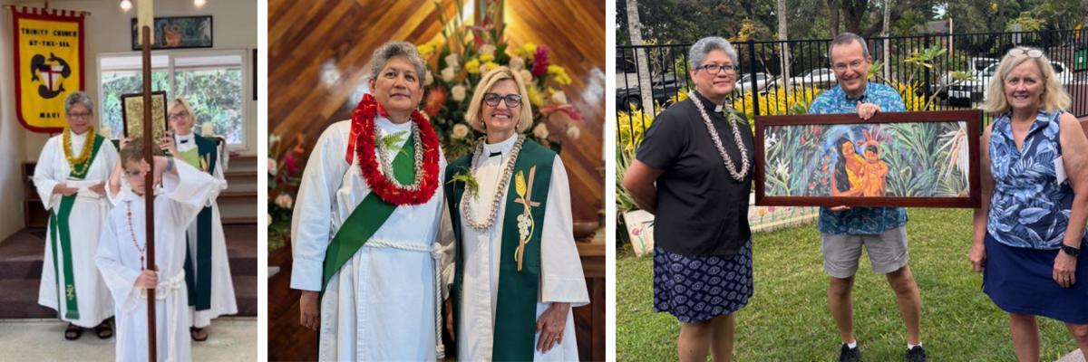 Pictured above left, Deacon Kalani was welcomed by the Trinity By-the-Sea congregation on November 9, where she assisted their Vicar, the Rev. Amy Crowe. They presented her with a framed collage of photos from her ordination followed by a special luncheon after the service. At center, they are pictured at Honolua United Methodist Church where the Holy Innocents 'ohana has been worshiping after the loss of their church building. At right, Bob and Katy Shroder presented Kalani with a beautifully framed print of the historic painting that hung above the Holy Innocents altar. The following is an excerpt from the Trinity newsletter along with these photos of the Holy Innocents 'ohana: