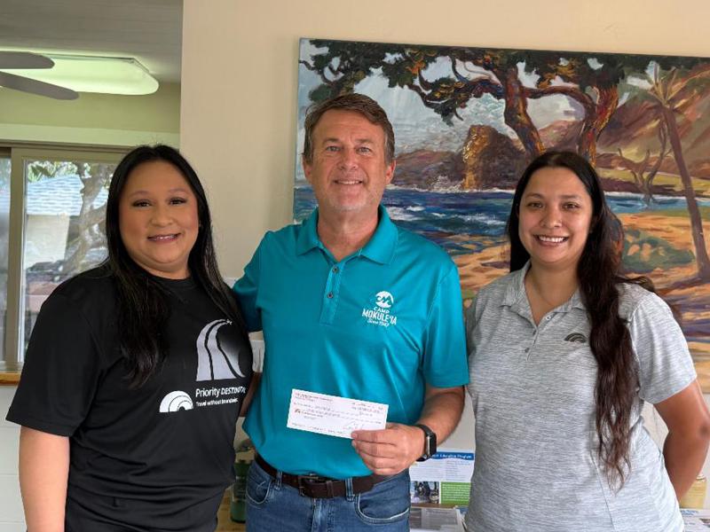 At right, Darrell Whitaker, Camp Mokulē'ia's Executive Director, accepts a check for $10,000 from the folks of the First Hawaiian Bank Foundation. The Camp was awarded a grant to support their "Families Can Survive" program. It is an annual 3-day camp for families who have been impacted by childhood cancer. (Photo from the Camp Mokulē'ia e-news)