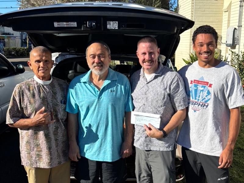 While our churches give graciously to their communities throughout the year, we give special thanks to our community partners who support the Diocese. Pictured above left is Archdeacon Steve Costa with Max Tanaka, owner of Ani's Bakery, who presented a check to Bill Slocumb, St. Elizabeth's Church Administrator, and Kū Ka'ahanui, Manager of Wallyhouse. (Contributed photo)