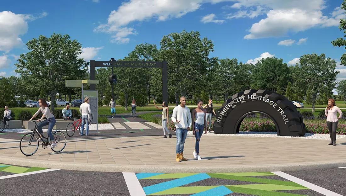 The Rubber City Heritage Trail is a proposed multi-use trail linking the Akron neighborhoods of East Akron, Middlebury, University of Akron, South Akron, Firestone Park, and Kenmore via an abandoned rail line. The trail follows 6-miles of the former ABC rail line that provided service to tire and rubber companies of Akron, including Goodyear, General Tire, BF Goodrich and Firestone. Now, the rail corridor is majority owned by the City of Akron. The Rubber City Heritage Trail is a major component of the City’s growing bicycle network as it allows safe pedestrian travel for all abilities and destinations: recreation, school, work, etc.