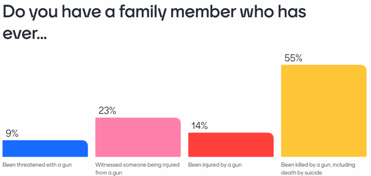 - Below you will find two sets of responses that display the experiences some of our graduates who were in the room have had with gun violence (note: these charts do not represent those who have had more than one experience with gun violence, of which there are many).