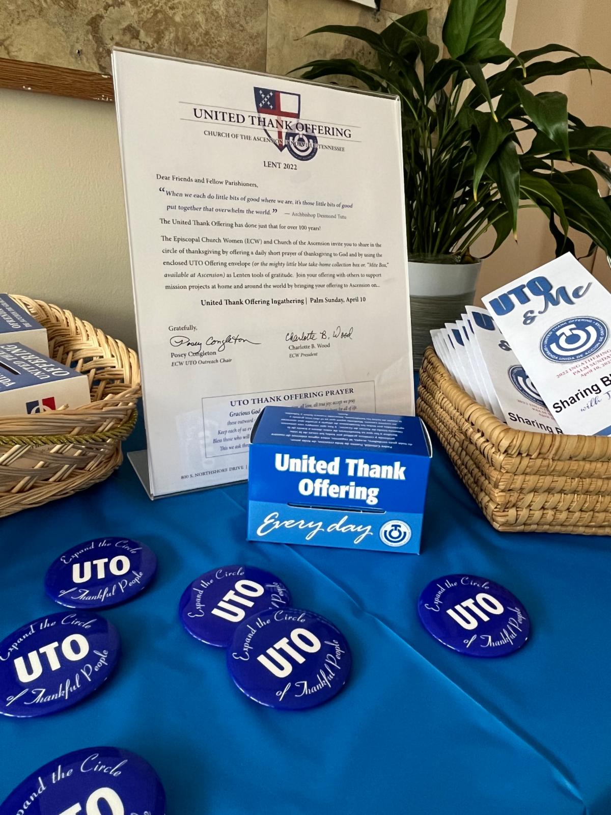 The Episcopal Church Women and Church of the Ascension invite you to share in the circle of thanksgiving by offering a daily short prayer of thanksgiving to God and by using the UTO Offering take-home collection box as Lenten tools of gratitude. Join your offering with others to support mission projects at home and around the world by bringing your offering to Ascension on Palm Sunday, April 10 for the United Thank Offering Ingathering.