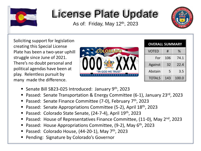 I want to give a "Tip of the Hat" 🎩 this month to all the outstanding individuals working to bring SB23-025, "In God we Trust" license plates to reality. If you worked on this project, THANK YOU!!! A very special shoutout to: