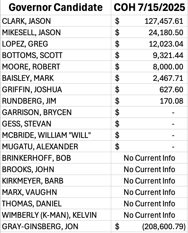 Let's cut through the fluff and focus on real money, because in politics, that's the true test of viability, isn't it? Recent filings (see chart below) show a few kinda standouts that scream, "I might actually survive the first debate without begging for gas money." Victor Marx, fresh off his entry a few days ago, is already poised to rake in serious cash, think seven-figure sums from donors who remember his track record in the private sector, not to mention his ties to conservative circles that could fund a small army. But then we look at the rest of the pack, and it's a parade of paupers. Some of these folks have cash that wouldn't cover a decent steak dinner at Del Frisco’s, let alone a statewide ad buy. Why are they still in? Ego? A misguided belief in fairy-tale upsets? Sure, we've all heard those inspiring stories of underdogs winning races on tiny budgets—remember that guy who rode a viral YouTube rant to victory for under $500? But this is Colorado, folks, where the left has turned our once-red strongholds into progressive playgrounds faster than you can say "legal weed." In a state overflowing with blue like the depths of Grand Lake, money isn't just helpful, it's oxygen. Without it, you're just gasping.