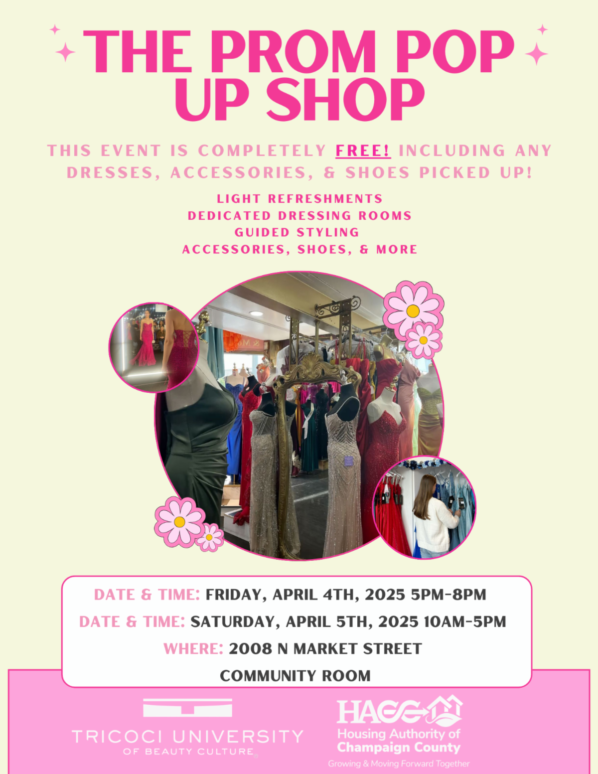 The Housing Authority of Champaign County is hosting a Prom Dress Pop-Up Shop! This event is completely FREE, including the items picked up!