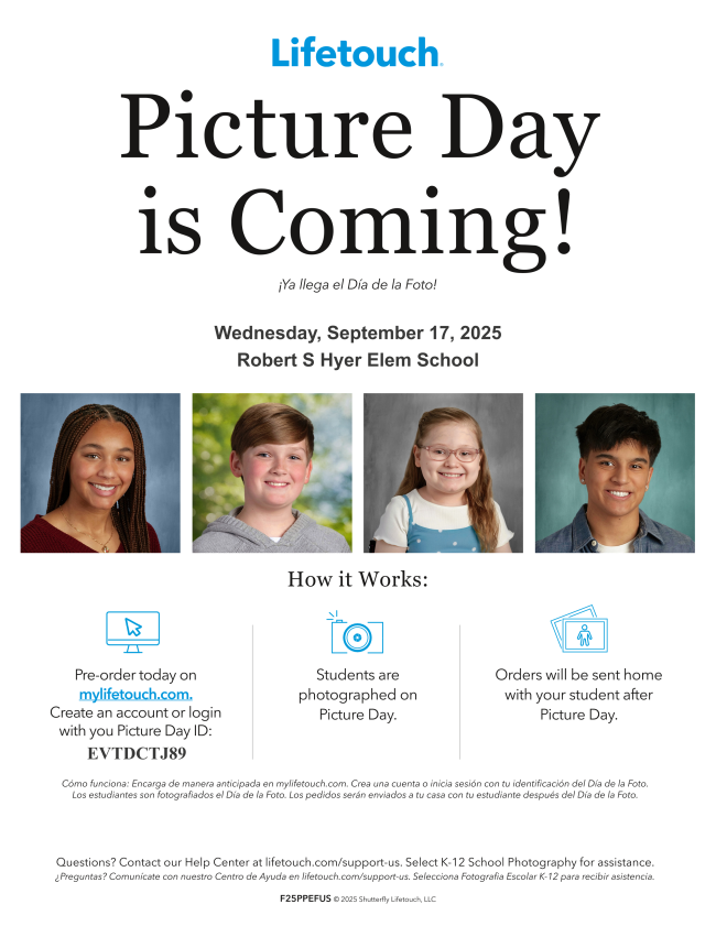 Be sure to send your Husky to school camera ready on Wednesday, September 17th, when Lifetouch/Shutterfly will be on campus to take individual photos. Order forms will be sent home with your child. Or Pre-order today on