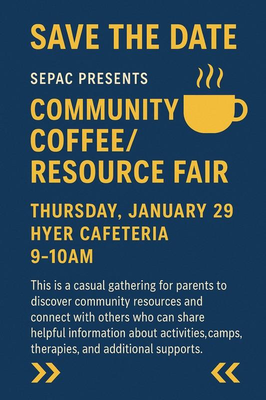 - January 29: SEPAC Community Coffee/Resource Fair at Hyer from 9:00-10:00 a.m.
