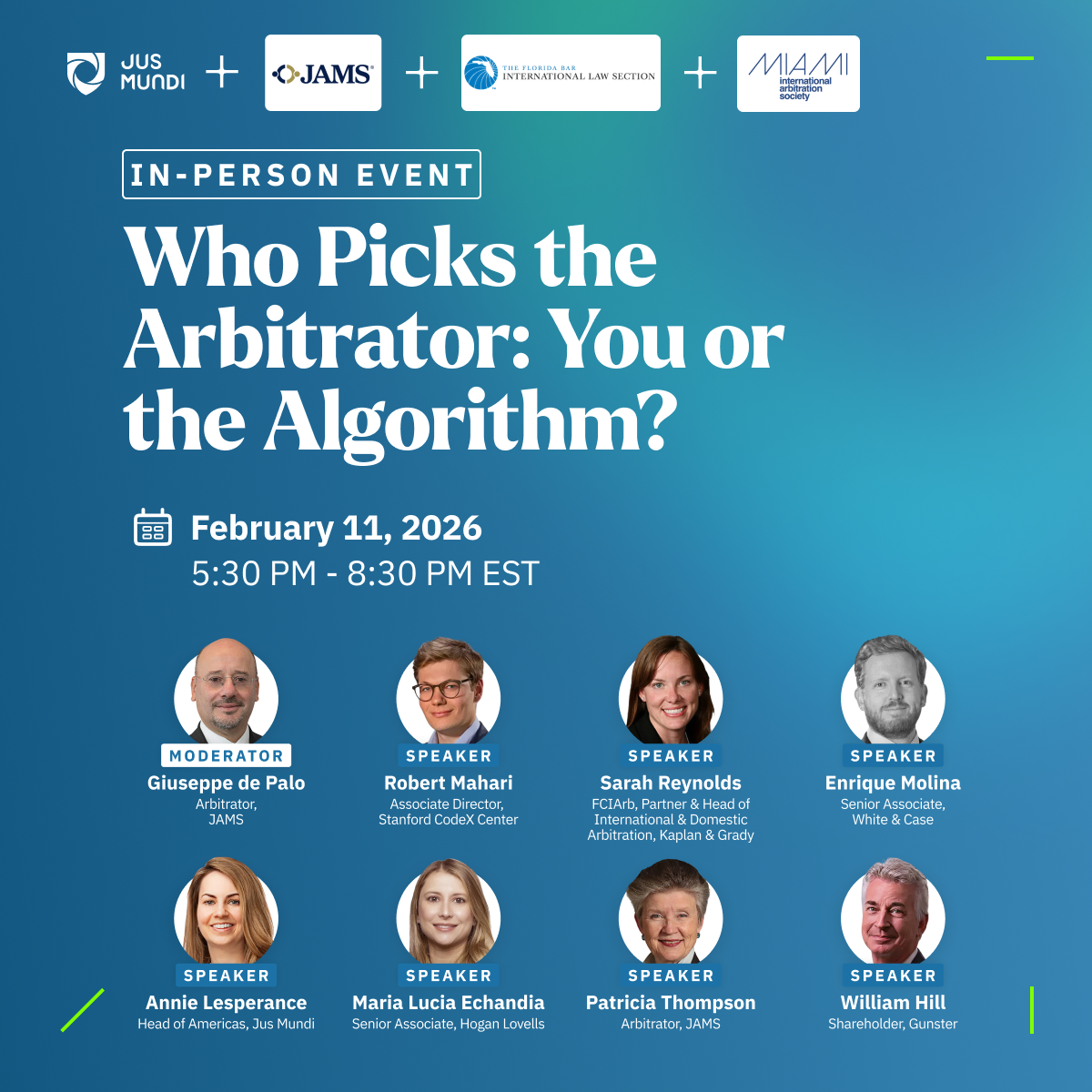 February 11, 2026, 5:30 – 8:30 p.m.: “Who Picks the Arbitrator: You or the Algorithm?”, Event hosted by JAMS and Jus Mundi, @ JAMS, One Biscayne Tower, First Floor Conference Center, 2 South Biscayne Boulevard”