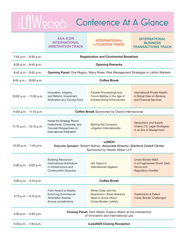 Expect to join legal practitioners from 20+ jurisdictions for plenary sessions, a stand-out keynote, incredible networking, and three breakout tracks: International Litigation, International Business Transactions, and AAA-ICDR International Arbitration.