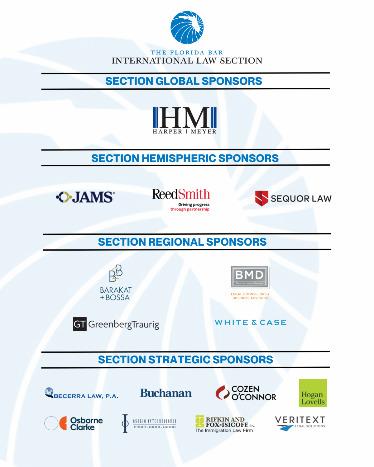 We look forward to another year of innovative programs where we can advance international law in Florida and further promote our sponsors.If interested in sponsoring the ILS, please contact our Treasurer, Jeffrey Hagen at jhagen@harpermeyer.com or Vice Treasurer, Adrian Nuñez at nuneza@gtlaw.com for more details.