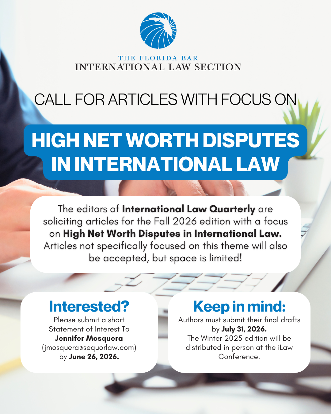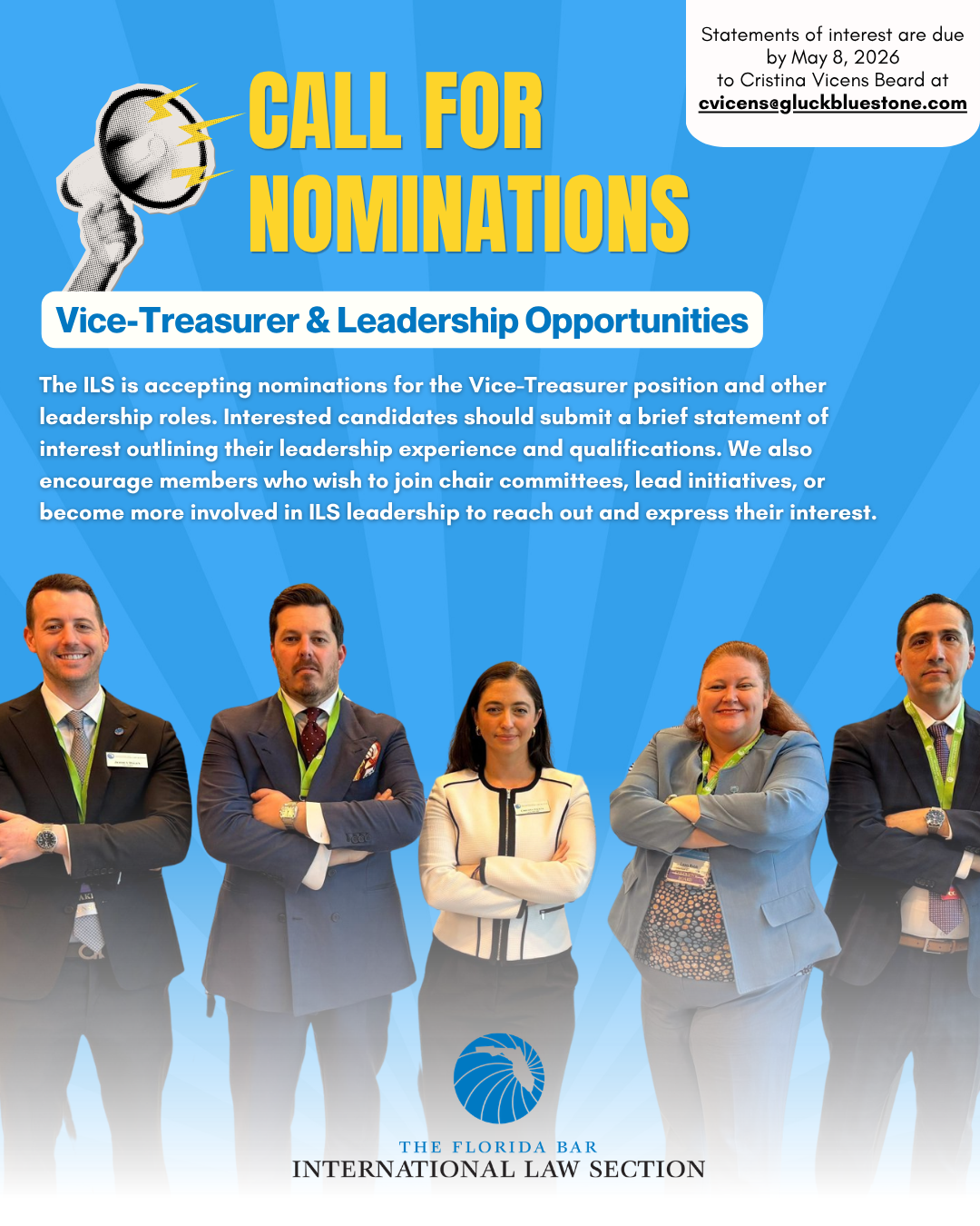 Last week, the ILS held a Membership Drive Cocktail at Caffe Abbracci! It was a wonderful opportunity for students and fellow colleagues to connect with our community. Thank you to everyone who attended and to Hogan Lovells for sponsoring this event. | Yesterday, the ILS held the latest Lunch & Learn in Miami, featuring Emilio Garcia Silvero, Chief Legal and Compliance Officer at FIFA and moderated by Ed Davis of Sequor Law. Thank you to everyone who attended! | Now accepting nominations for Vice-Treasurer and ILS leadership positions! Interested in serving on the Board or getting more involved? Submit a brief statement of interest highlighting your experience to (Cvicens@gluckbluestone.com) before May 8, 2026 and let us know how you’d like to contribute to ILS. | Call for International Law Quarterly Articles! | | The editors of the International Law Quarterly are making a call for articles for the Fall 2026 edition of the International Law Quarterly with a focus on high net worth disputes in International Law! If you are interested please submit a short statement of interest to Jennifer Mosquera at jmosquera@sequorlaw.com by June 26, 2026. | The International Law Deskbook (Second Edition) is Here! | | |