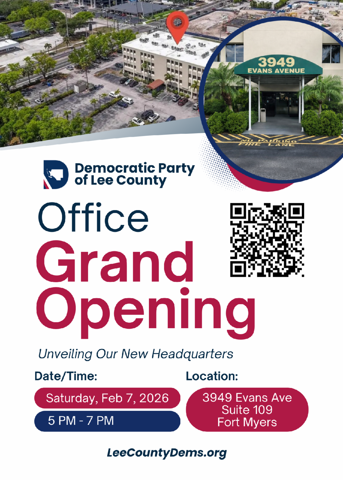 The Lee County Democratic Party is building a stronger, more inclusive Southwest Florida through community action, voter empowerment, and local leadership. This space is more than an office. It represents an investment in grassroots organizing and expanding civic participation throughout Lee County. Our new home is a welcoming, accessible space for clubs, volunteers, candidates and elected officials and our many community partners.