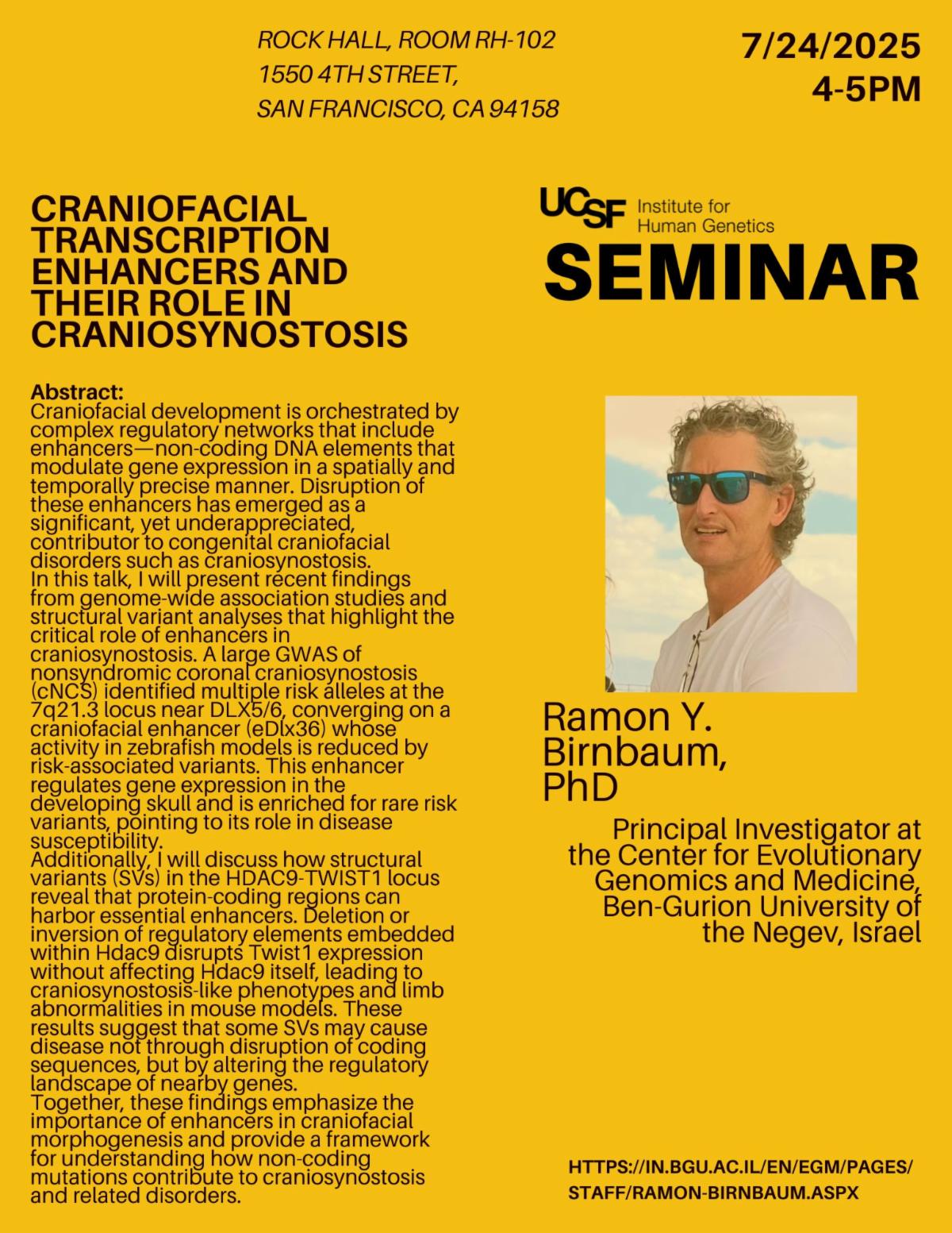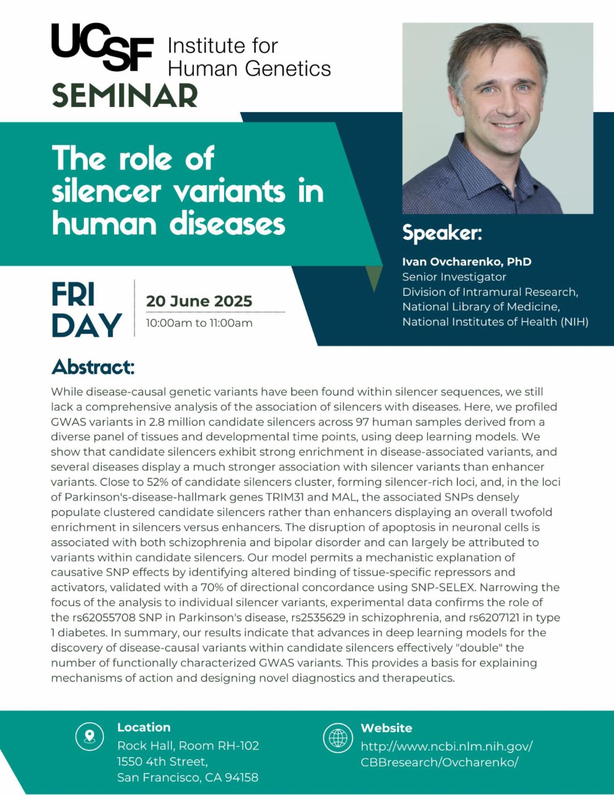 The UCSF Institute for Human Genetics, Center for Advanced Technology, and CoLabs co-host the technology seminar series. These seminars are free and open to all. They occur every month and bring researchers to hear about the latest technologies and applications.