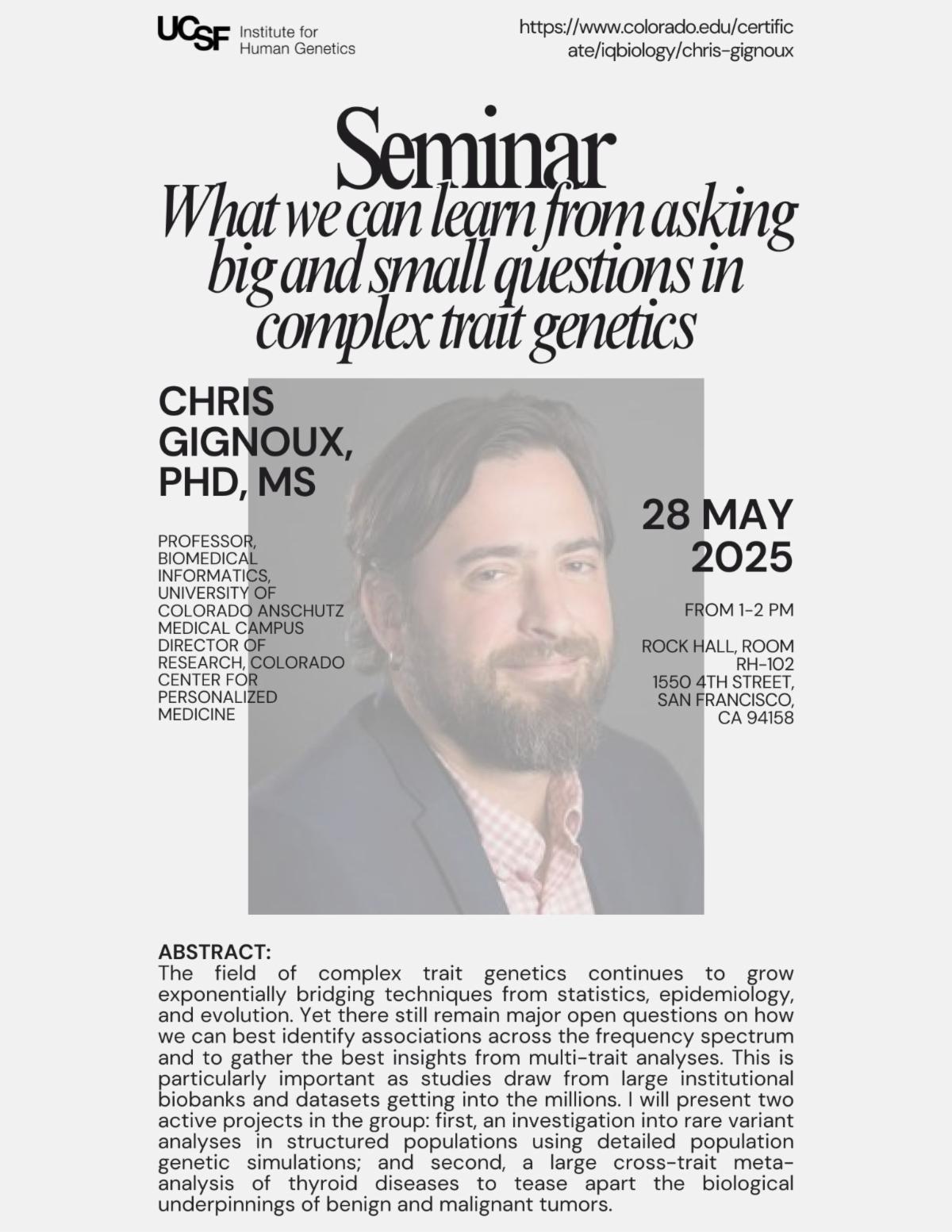 I'm very excited to inform you that our IHG computational faculty search has led to the hiring of Dr. Jeff Spence starting July 1st (see more details on Jeff below). I want to again thank the amazing computational search committee members Drs. Laurie Weiss, Sergio Baranzini, Tony Capra, Ryan Hernandez, Catherine Tcheandjieu, and Elad Ziv for all their hard work and dedication. In addition, we recently welcomed a new IHG member, Sawona Biswas. We are extremely enthusiastic about the potential contributions that these new faculty members will bring to our dynamic community.