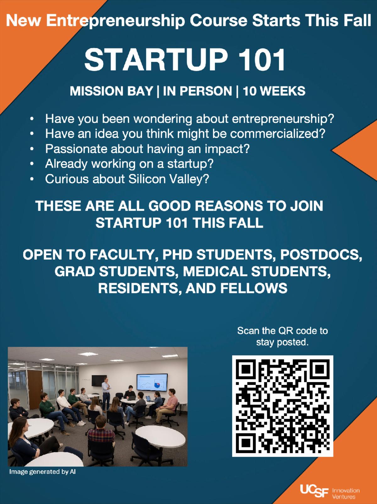 Innovation Ventures has been building a full program of entrepreneurship offerings this year and wanted you to know about our new course, Startup 101. It will be offered this fall in-person at MB for Faculty, PhD/PharmD’s, Postdocs, Grad Students, MDs, Residents and Fellows. The course is taught over 10 weeks by Silicon Valley business practitioners: CEOs, investors, entrepreneurs, executives, consultants and attorneys. Classes will be held at night once per week.