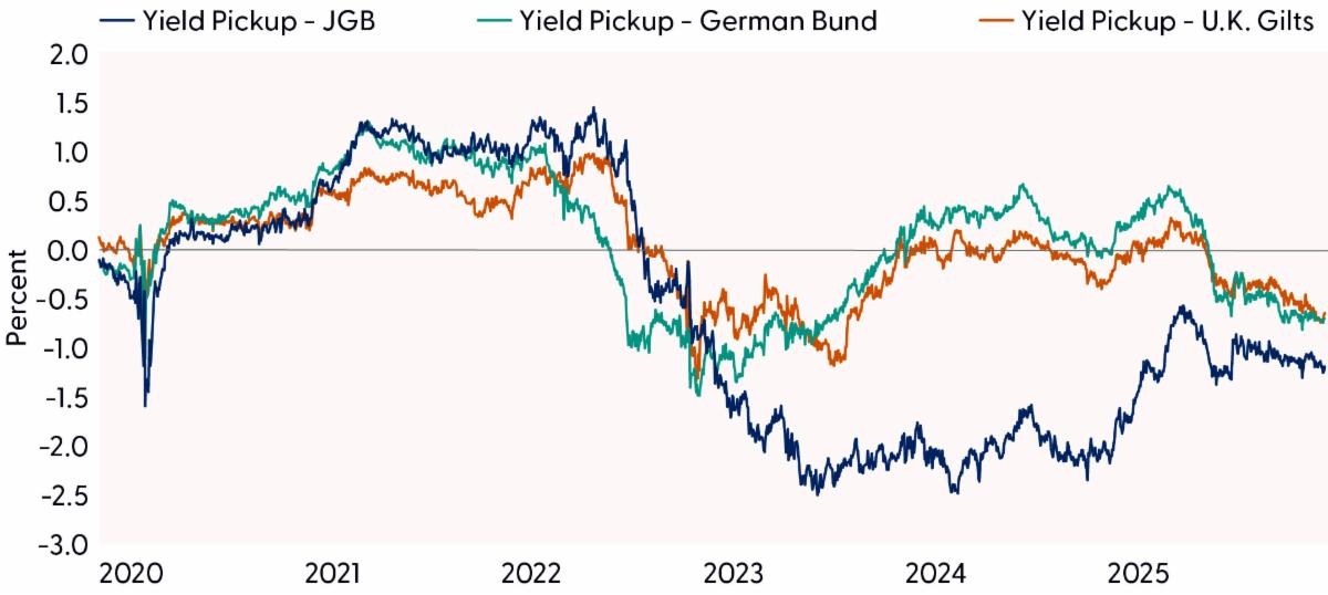 Difference in 10-year Foreign Government Yield vs 10-Year U.S. Treasury Yield Hedged to Foreign Currency