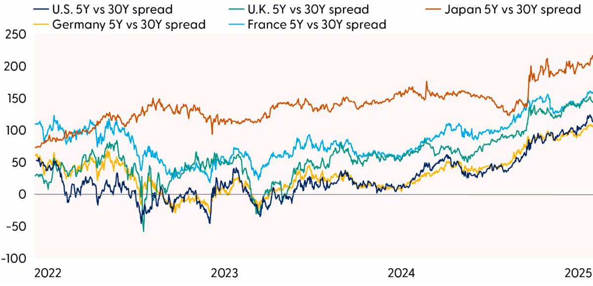 The combination of political instability and increased fiscal spending is showing up in global bond market yield curves. Investors are increasingly demanding higher term premiums to hold long-dated government debt in jurisdictions where political uncertainty threatens to derail fiscal discipline and economic stability. As such, while most short and intermediate term bond yields have fallen this year, 30-year yields have increased (or in the case of the U.S., not fallen as much as shorter maturity bond yields) causing yield curves to steepen to the highest levels in years. While inflation dynamics and central bank policy remain important, the recent steepening of yield curves underscores the budding influence of governance risk in shaping global fixed income markets.