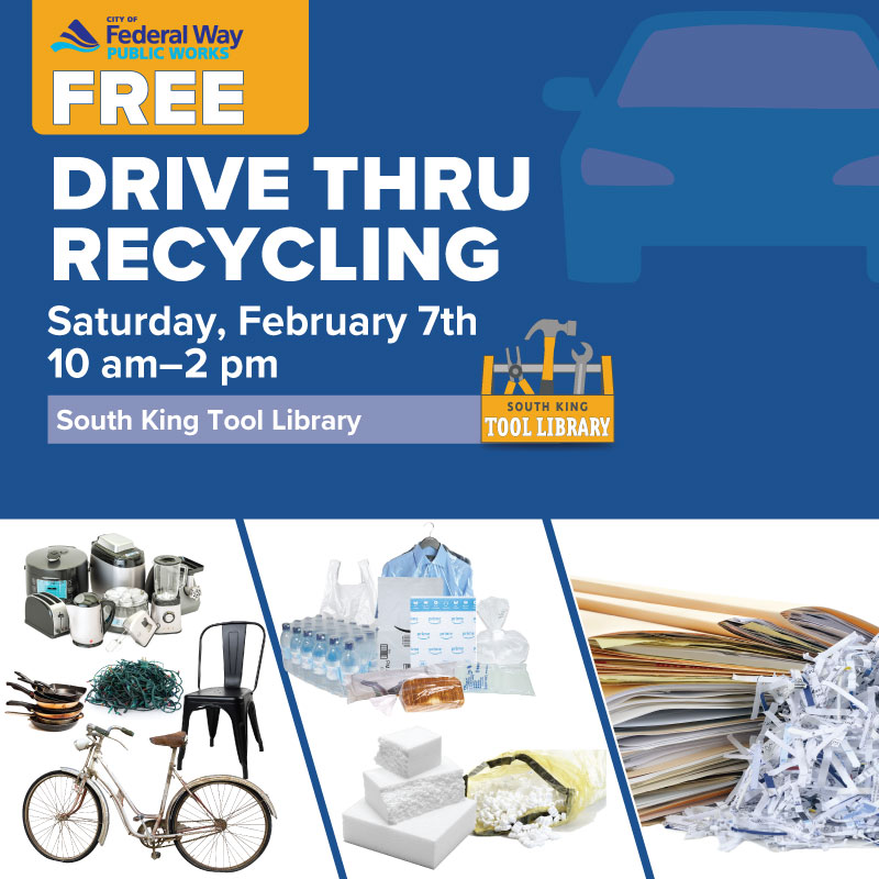 Join us for our free Drive-Thru Recycling Event at South King Tool Library on Saturday, Feb. 7, from 10 a.m. to 2 p.m. At this event, we are accepting scrap metal, holiday lights and electrical cords, styrofoam, and plastic film.