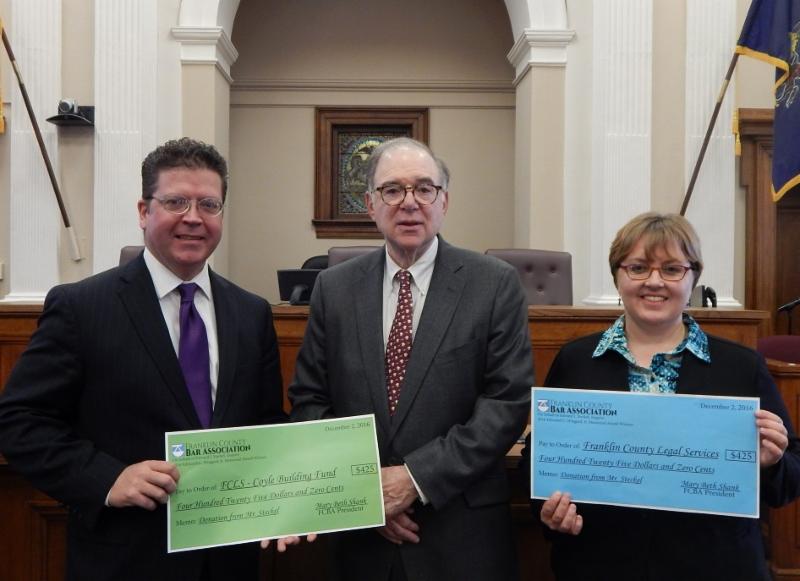 Attorney Steckel selected the Coyle Free Library Building Fund and Franklin County Legal Services as donation recipients. Pictured: Commissioner David Keller, Ed Steckel and Gloria Keener.