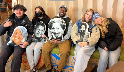 "Students and Pendarvis [had] a conversation about which storytellers, past and present, inspire them to write, build community, and fight for social justice in Oakland and beyond. Moreover, they are holding pillows with images of some important writers who inspire them, including (from left to right) Judith Tannenbaum, Octavia E. Butler, Toni Morrison, and Tongo Eisen Martin.