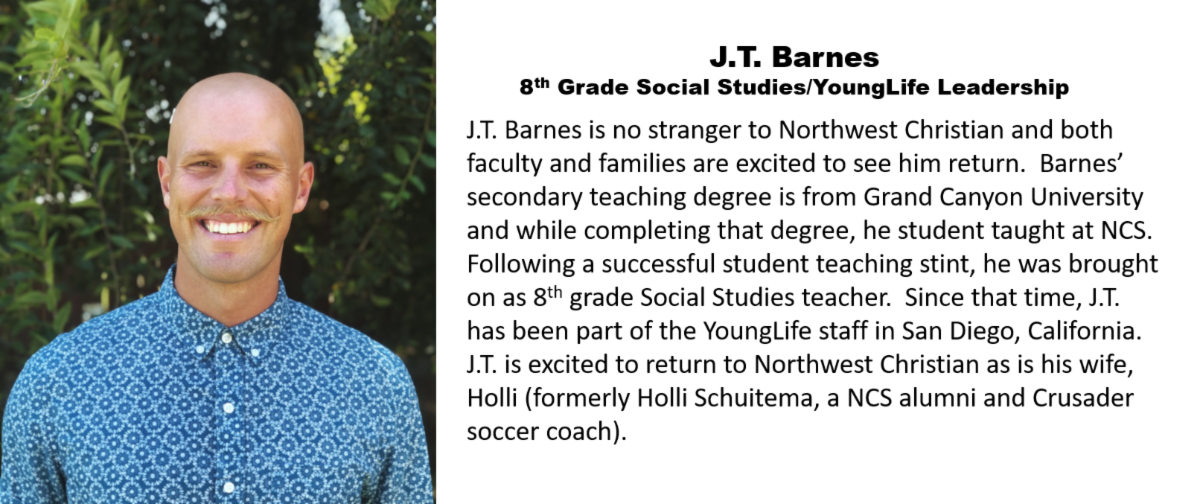 J.T. Barnes is also no stranger to the Crusader community. Fresh from a stint as a member of YoungLife staff in San Diego, Barnes has previously taught within the Northwest Christian Middle School. While in San Diego, J.T. assist middle school Wyldlife sponsor Kathy Gonzales to develop the YoungLife Leadership courses that are now part of the Frameworks program.