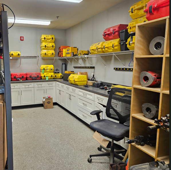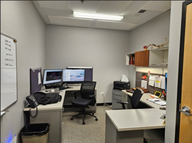 This time last year the survey department relocated their office space to a new location within the shop. The office became available with the expansion of the trucking department. The relocation included a paint refresh and additional desks for Justin Smith, Drew Kastning, and an area for field staff to have space to work on notes and discuss project specifics. The desks were positioned to easily collaborate along with a dry erase board for notes and instructions. The relocation created more storage space in the previous office to keep the robotics and GPS equipment better organized.
